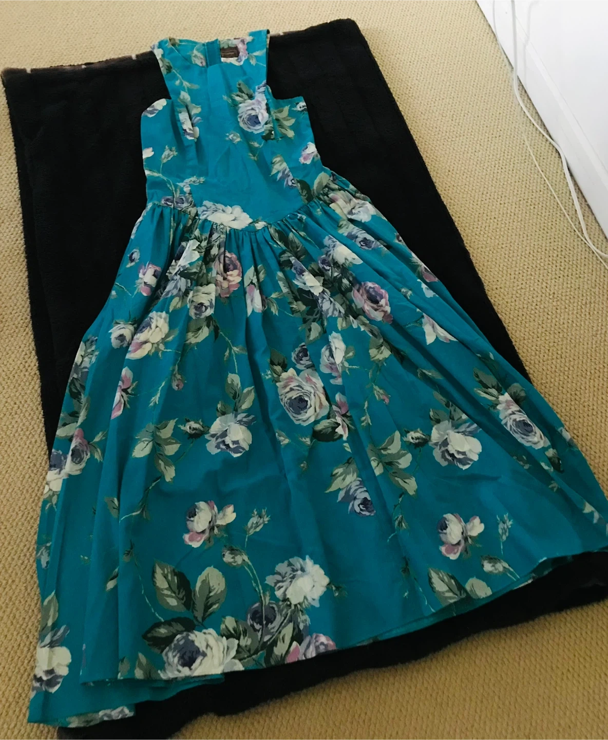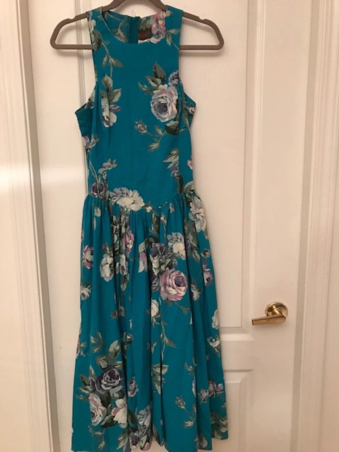 This sleeveless midi dress features a vibrant teal background with a delicate floral print. It has a flattering silhouette with a fitted waist and a flared skirt. Perfect for a garden party or a summer outing!