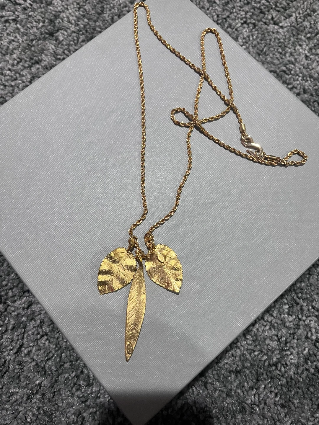 This gold-tone necklace features a delicate rope chain with a pendant adorned with three leaf charms. It's secured with a lobster clasp. The pendant's design is detailed and naturalistic.