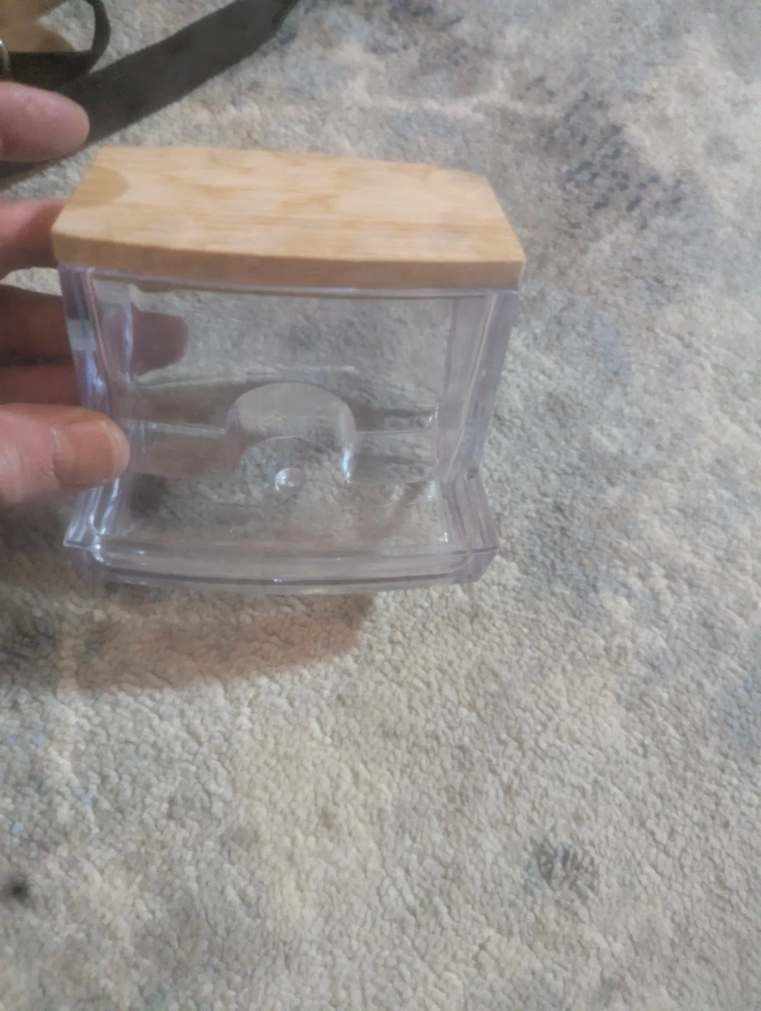 This clear plastic container comes with a light-coloured wooden lid. It's a handy little storage piece for small items. The base is made of clear plastic with a curved bottom edge.
