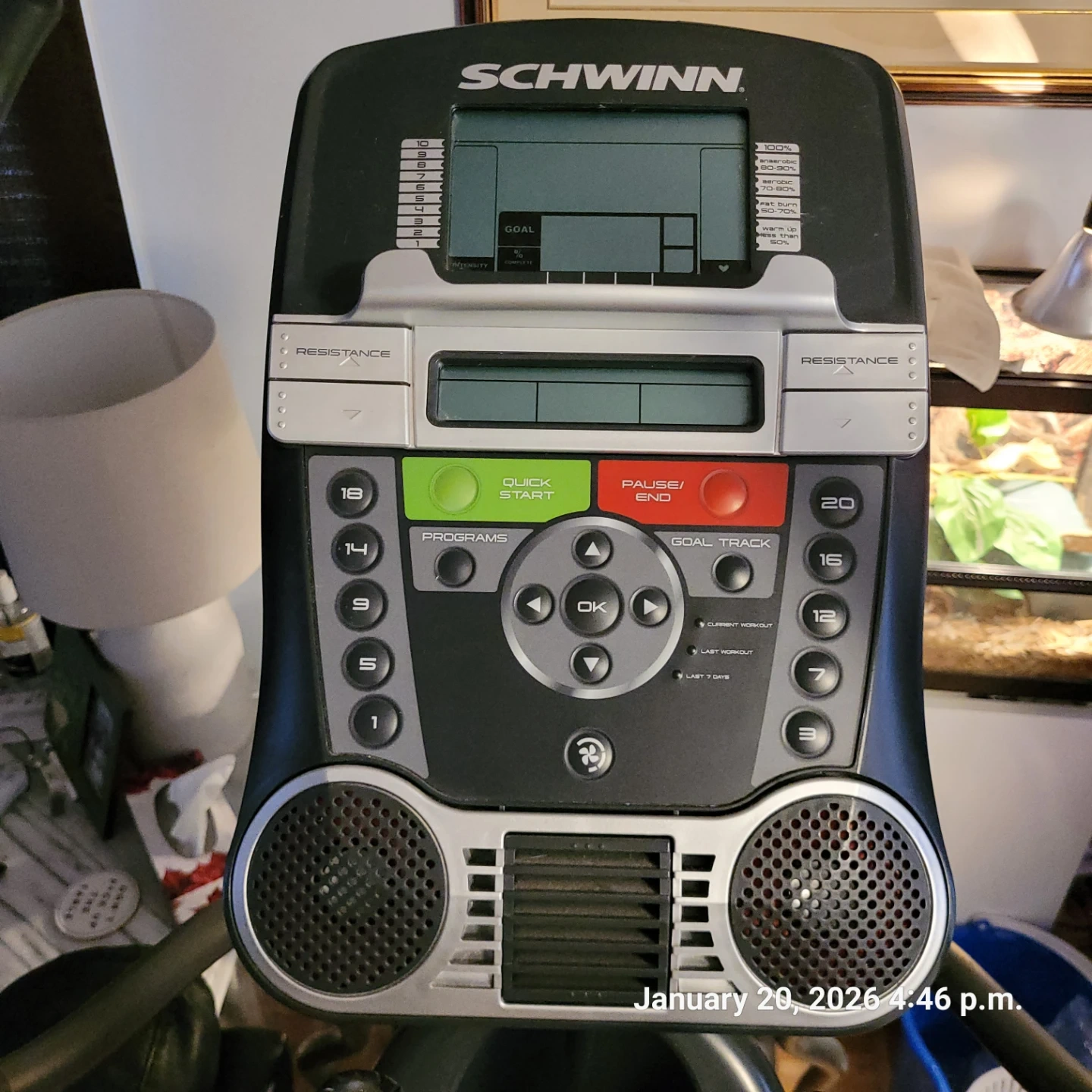 Get your sweat on with this Schwinn elliptical machine! It's in great shape and ready for a new workout buddy. Features include adjustable resistance and various programs to help you reach your fitness goals. Fan setting to cool you off while working out! Original price $1800. Comes with power plug. Some wear on foot pedals.