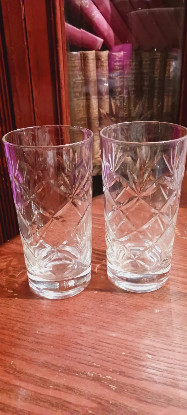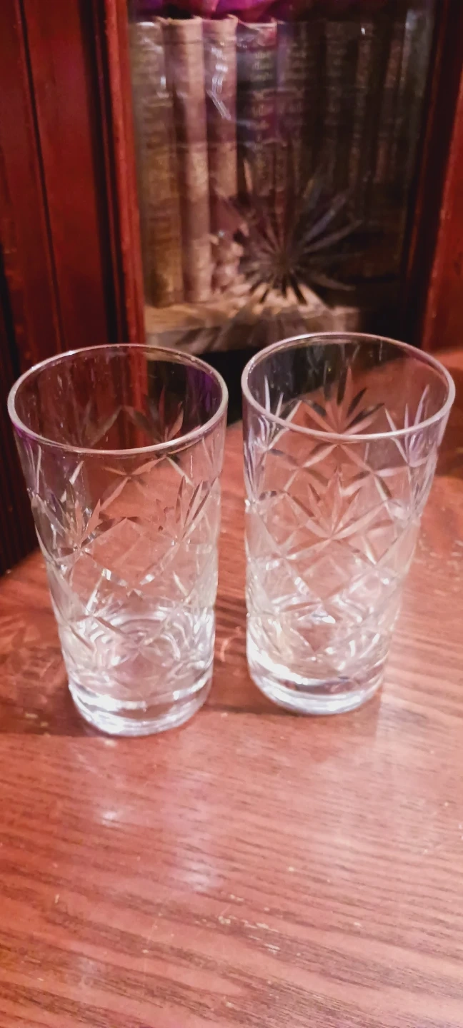 New ! Two beautiful crystal tumblers with a detailed cut pattern. These glasses have a classic design and are perfect for serving beverages. 6"×3". New. ALL MY PRICES ARE NEGOTIABLE !!