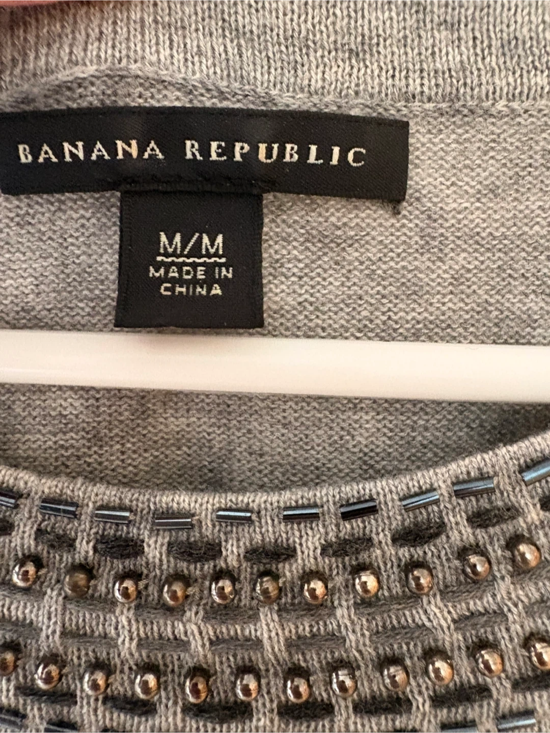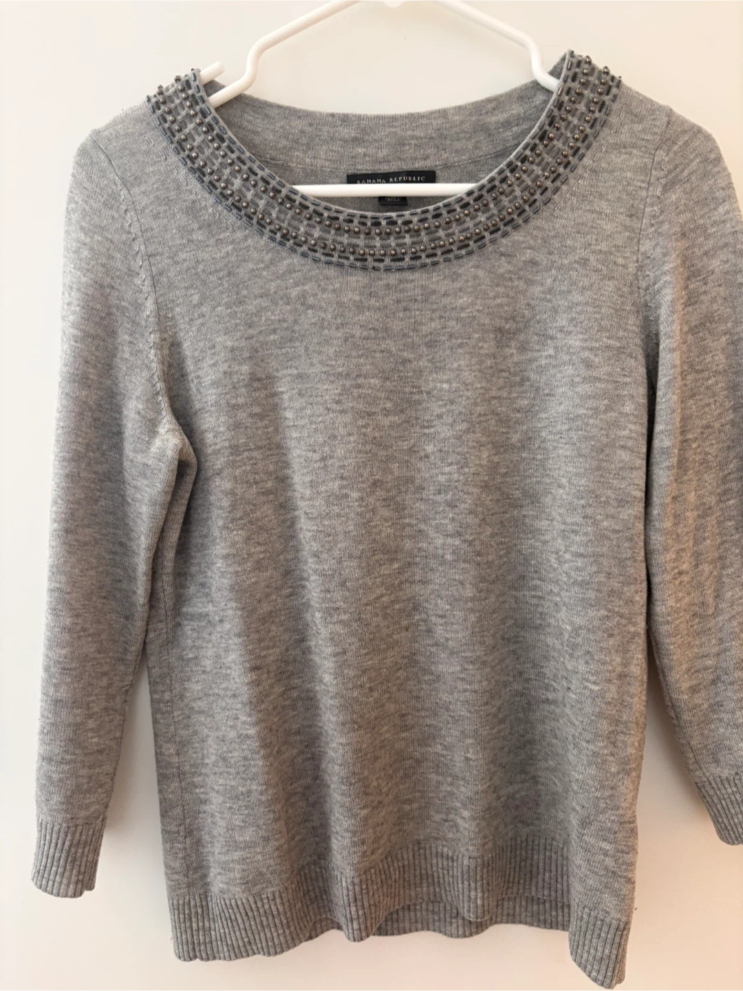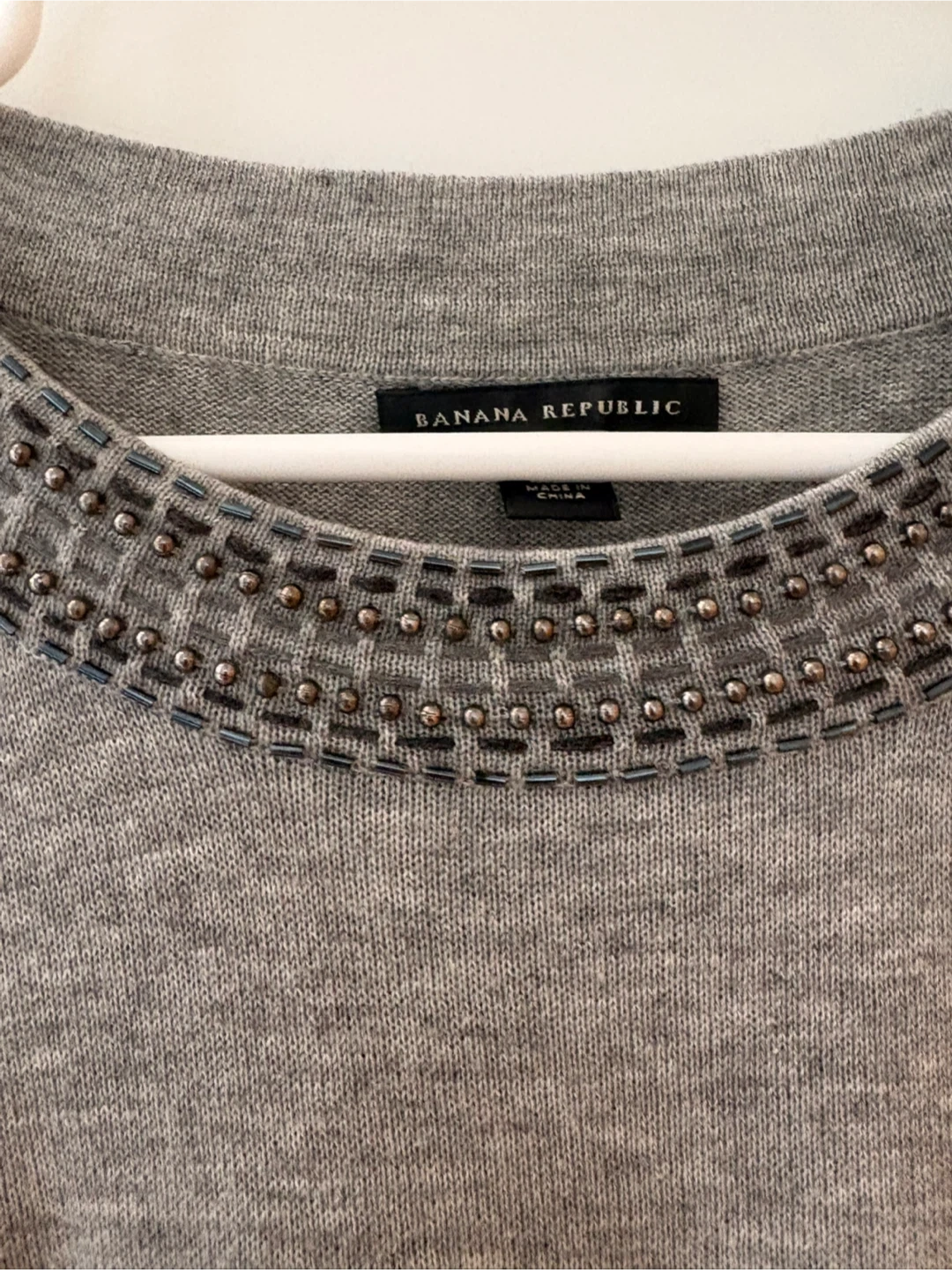 This grey Banana Republic sweater is a size medium. It features a beaded neckline detail. This sweater adds a touch of sparkle to any outfit!