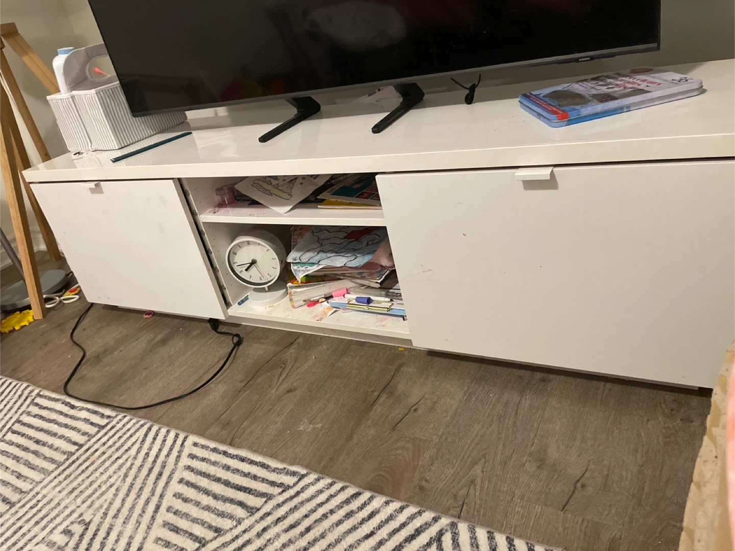 White TV stand with two cabinet doors and open shelving. It has ample space for media consoles and storage. Dimensions are not specified.
