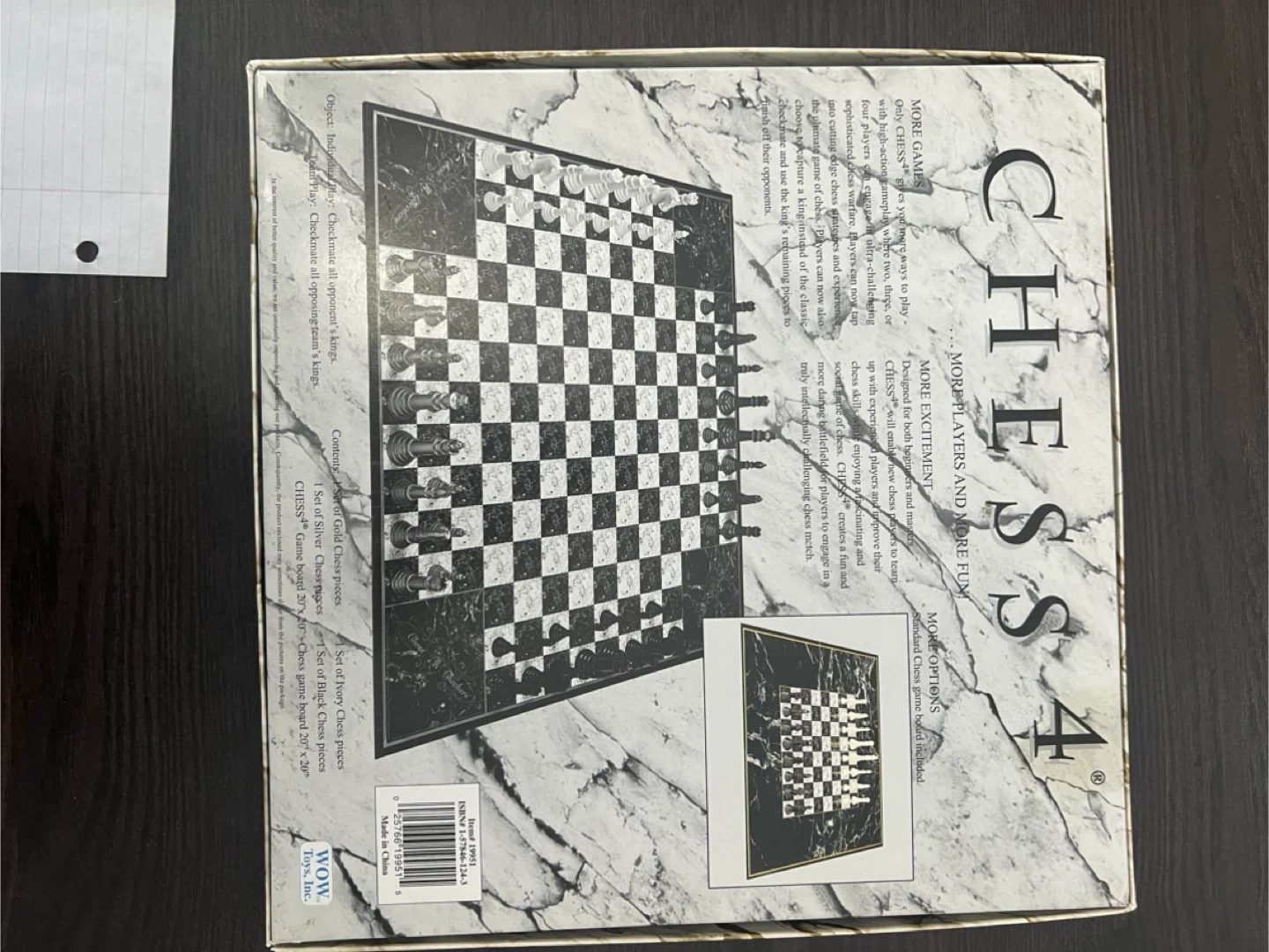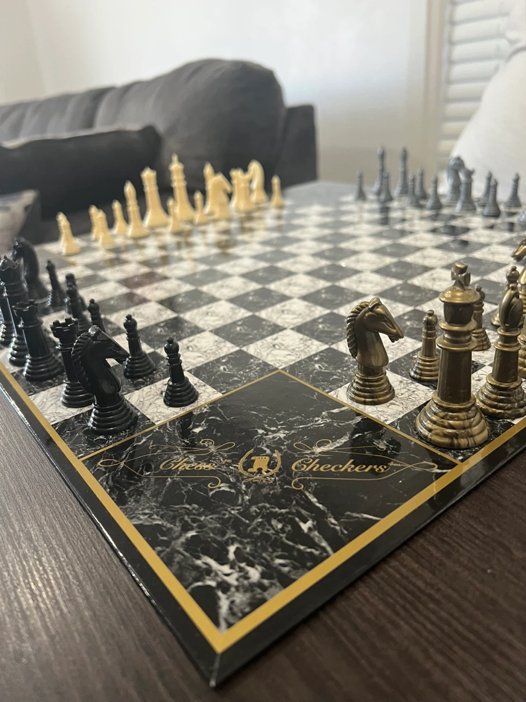Selling a Chess4 set that includes both chess and checkers! The board has a beautiful marble design, adding a touch of elegance to your game nights. It comes with gold and silver chess pieces, as well as black and red checkers pieces. The game board is 20" x 20". The box is included!