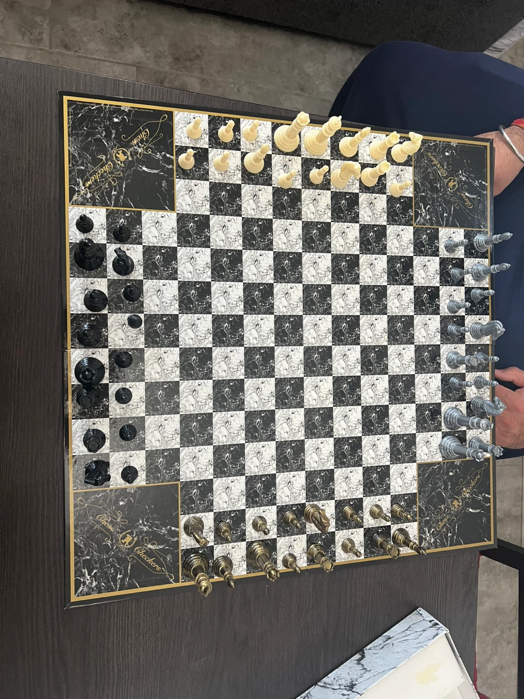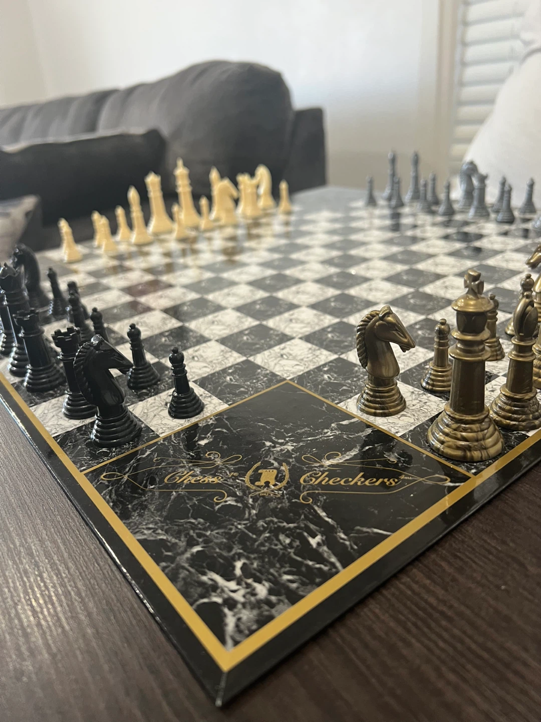 Selling a Chess4 set that includes both chess and checkers! The board has a beautiful marble design, adding a touch of elegance to your game nights. It comes with gold and silver chess pieces, as well as black and red checkers pieces. The game board is 20" x 20". The box is included!