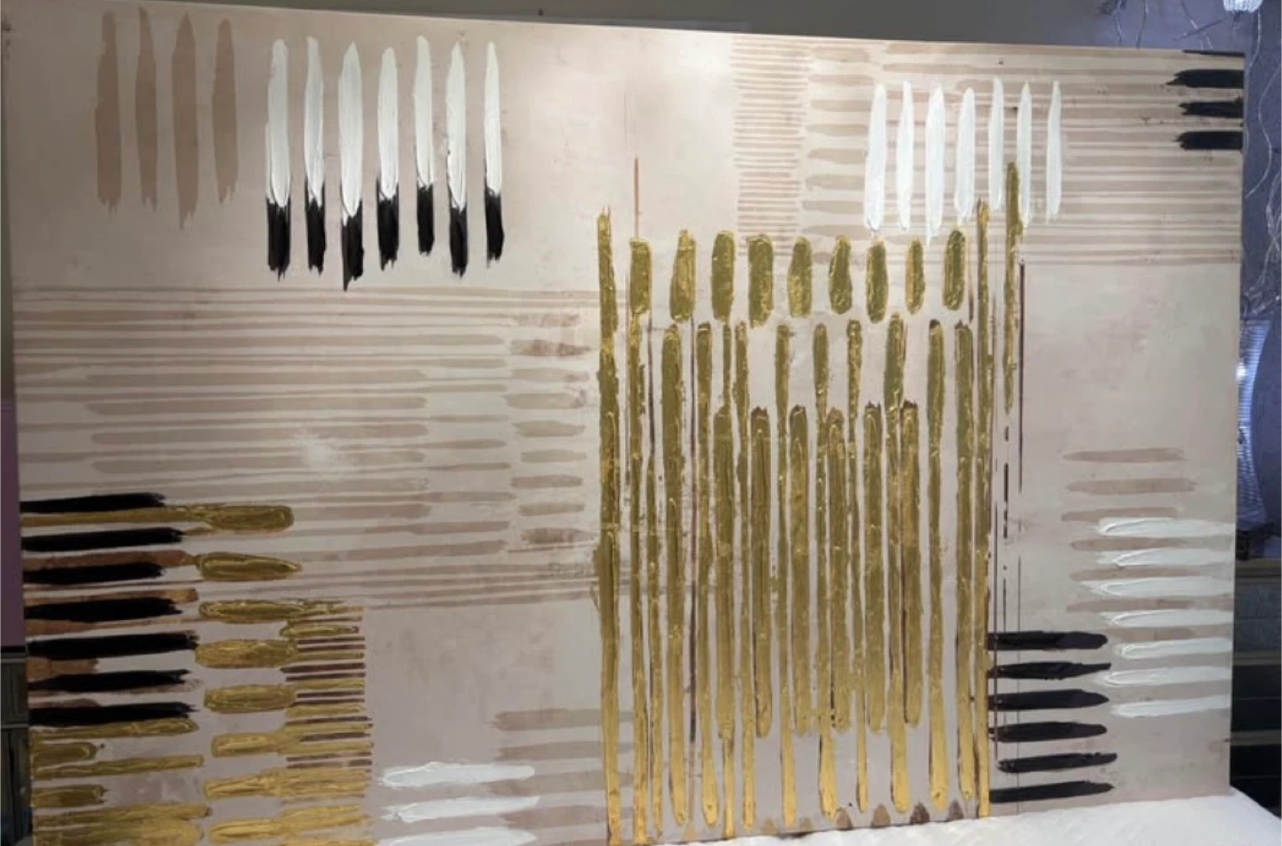 This large canvas features a modern abstract design with raised gold, black, and white paint textures. It's a statement piece that'll add a chic touch to any room. The neutral background makes it versatile for various decor styles. Add some flair to your living space!