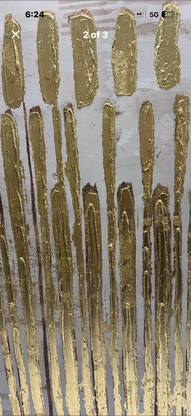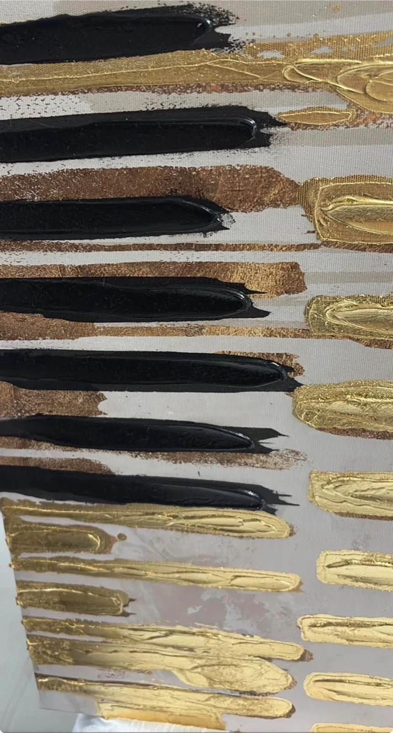 This large canvas features a modern abstract design with raised gold, black, and white paint textures. It's a statement piece that'll add a chic touch to any room. The neutral background makes it versatile for various decor styles. Add some flair to your living space!