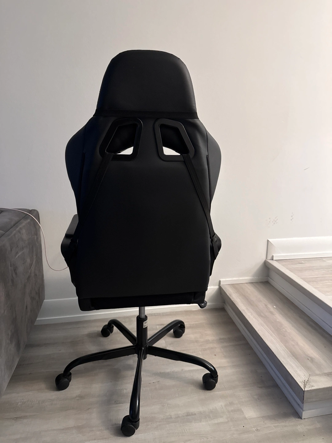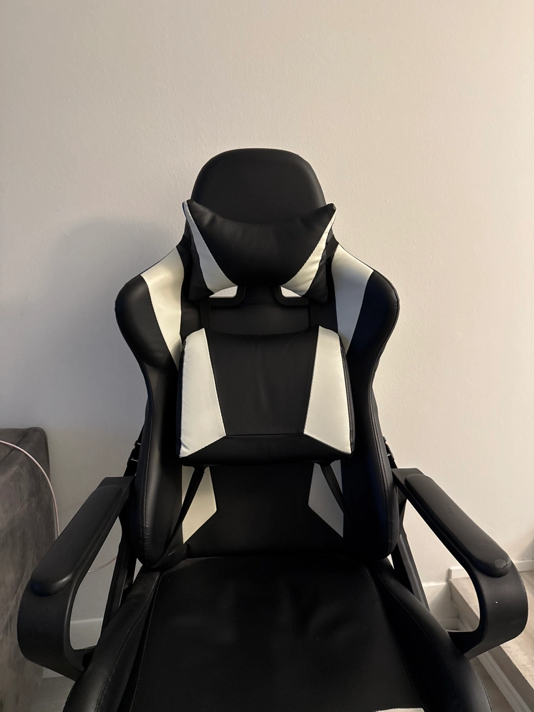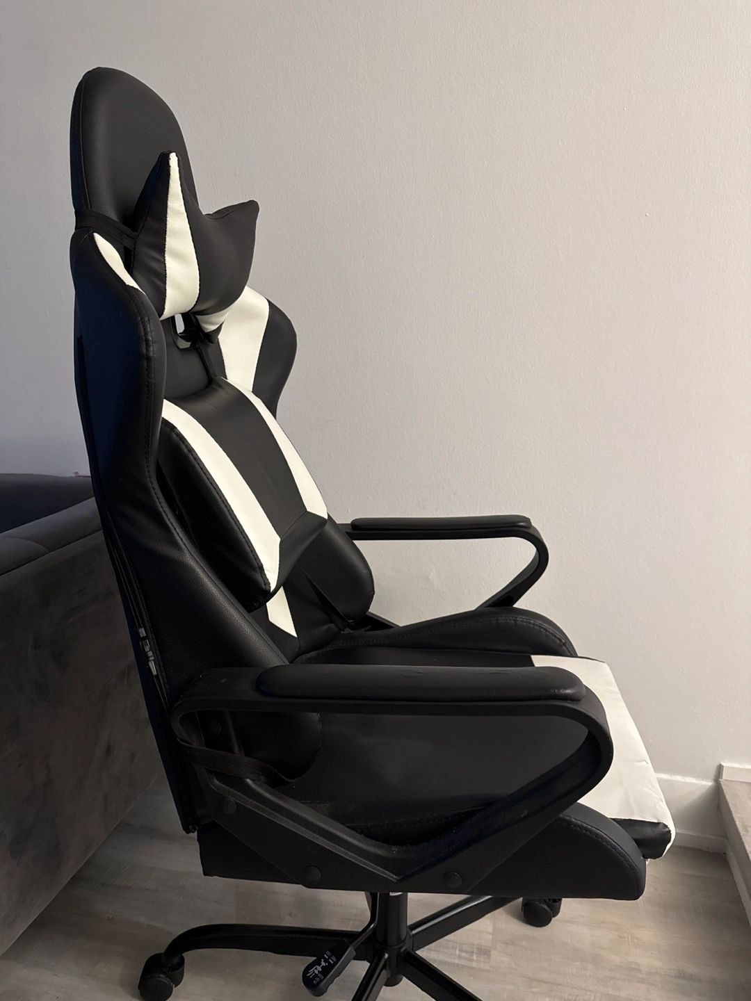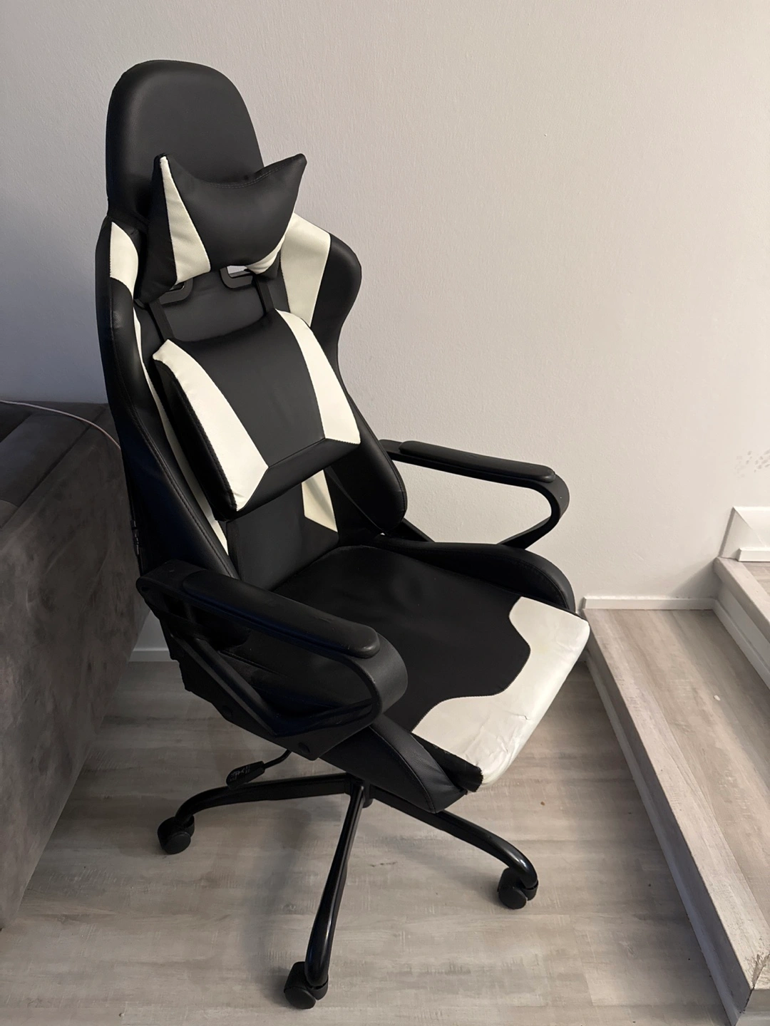 Comfortable gaming chair, black and white colour scheme. Features adjustable height. Good for long gaming sessions or home office use. Small wear and tears.