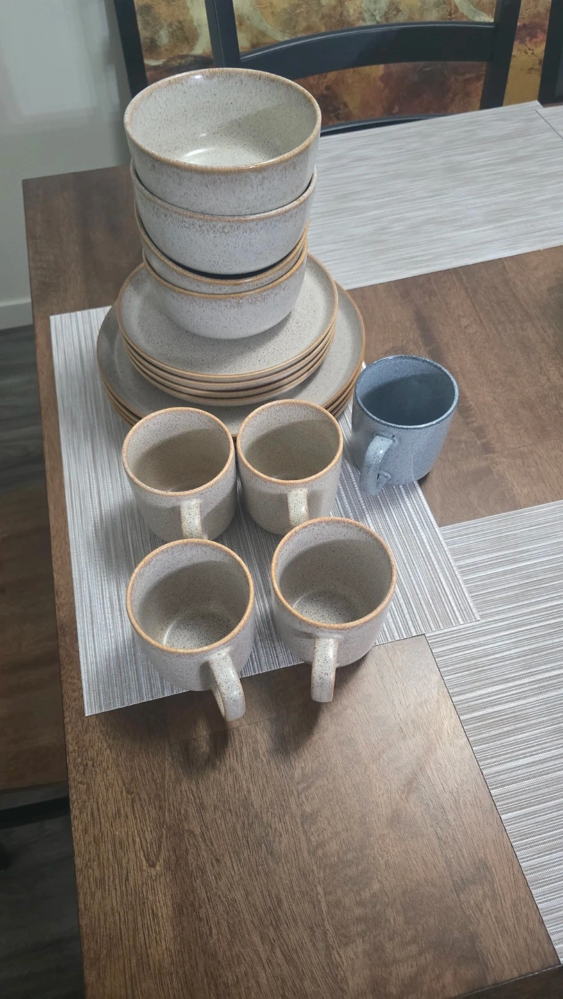 Selling a stoneware dinnerware set, perfect for everyday use or special occasions. The set includes plates, bowls, and mugs, all in a neutral colour that will complement any table setting. They're in great shape and ready for a new home!