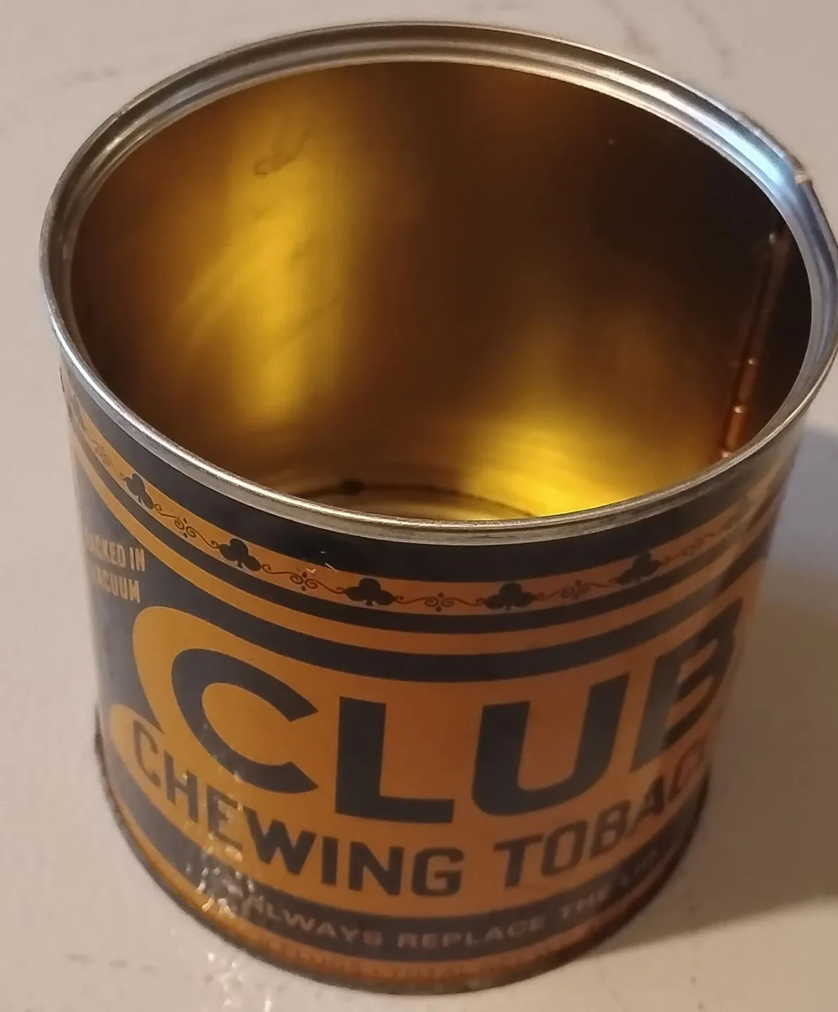 Vintage Club brand chewing tobacco tin. It's made of metal. This tin is empty and shows some signs of age.