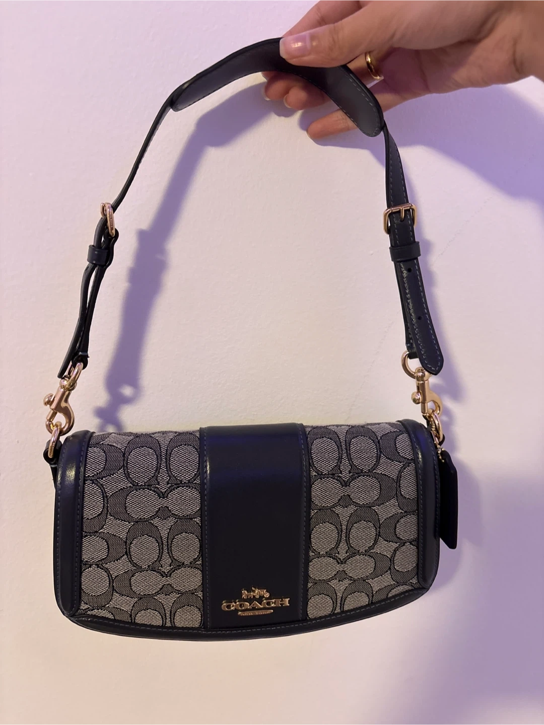 Selling a cute Coach Ergo shoulder bag in the signature denim pattern with black leather accents! It's a stylish and compact bag, perfect for everyday use