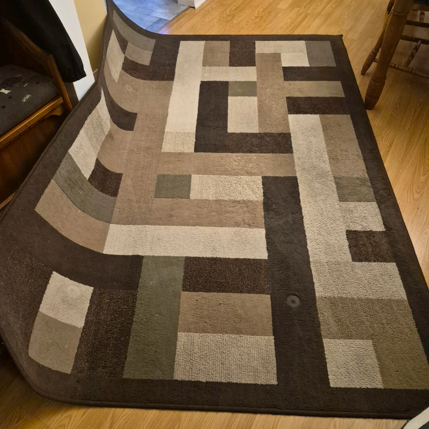 Brown and beige geometric patterned area rug. Adds a modern touch to any room. Suitable for living areas or bedrooms. Has been in dining room. Low traffic area. Pick up.