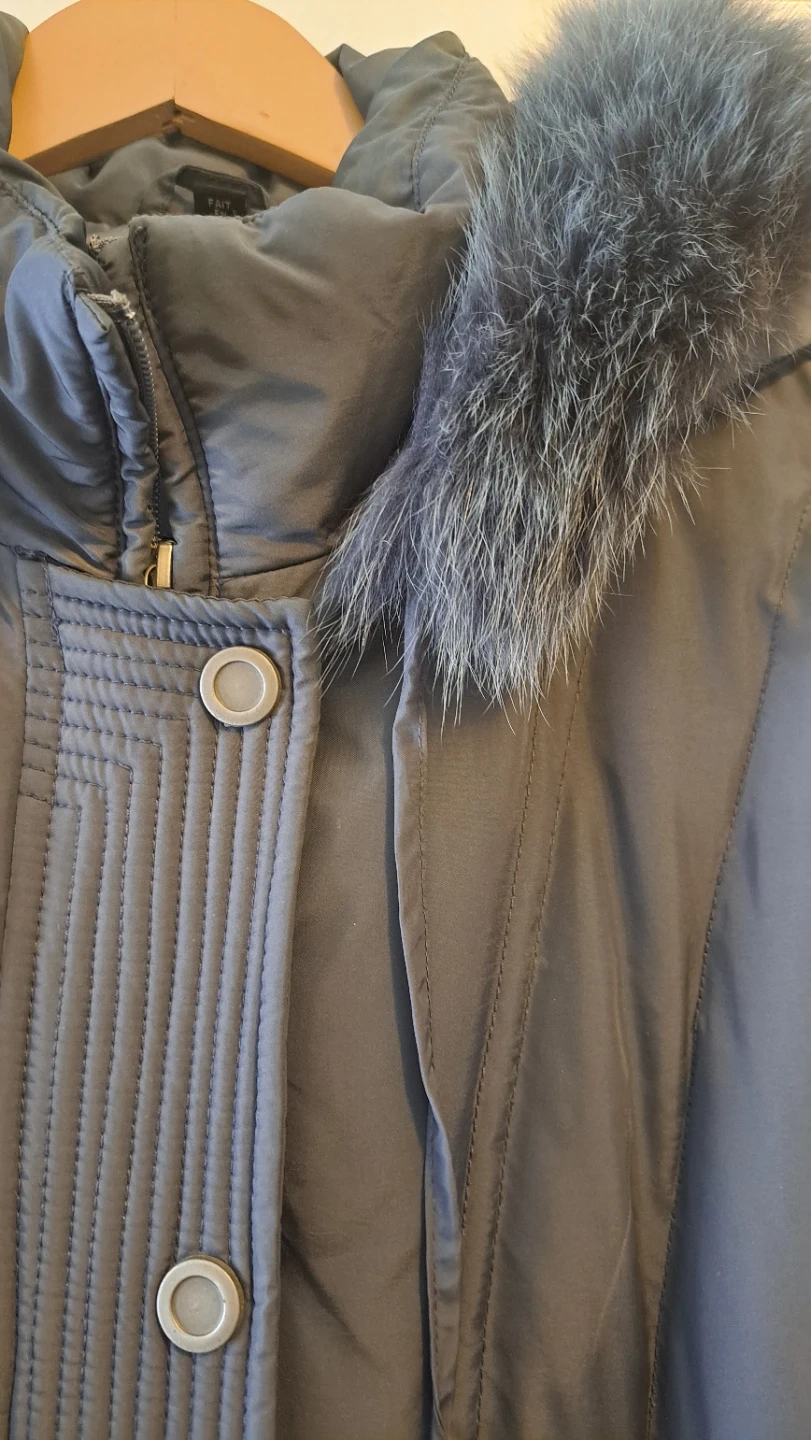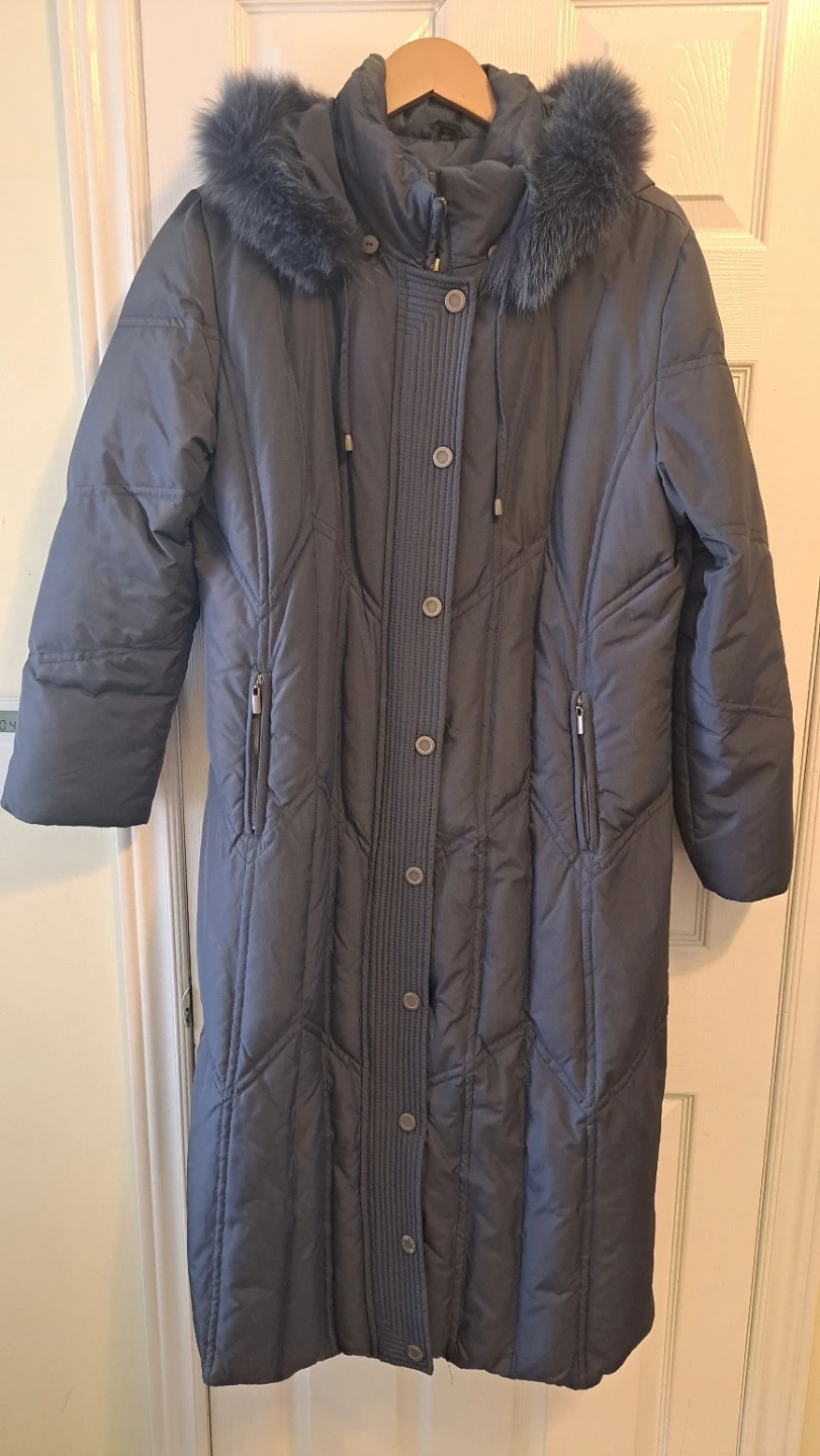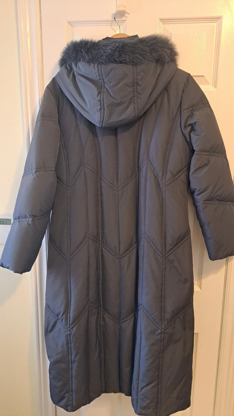 Warm grey Nugget Down puffer long coat. Features a detachable fur-trimmed hood and full button and zipper closure. Side pockets with zippers. Size L/G.