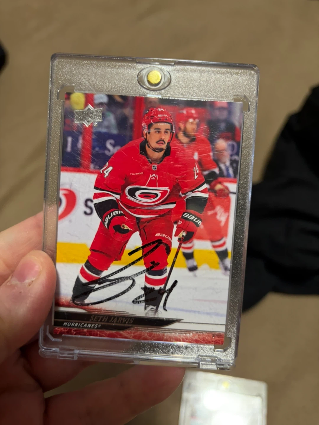 Authentic Seth Jarvis autographed Upper Deck hockey card. Features him in his Carolina Hurricanes jersey. Includes a protective sleeve.