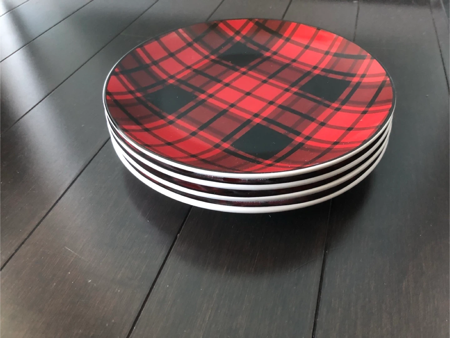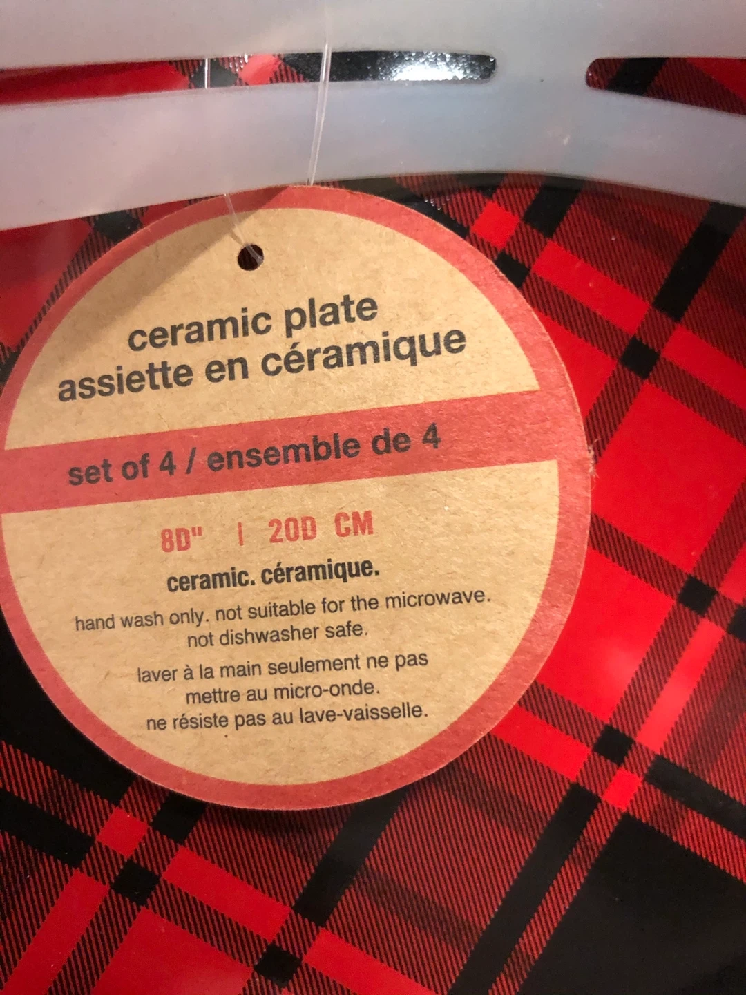 Selling a set of four ceramic plates with a red plaid pattern. They are 8 inches (20 cm) in diameter. Please note that these plates are hand wash only and not suitable for microwave or dishwasher use