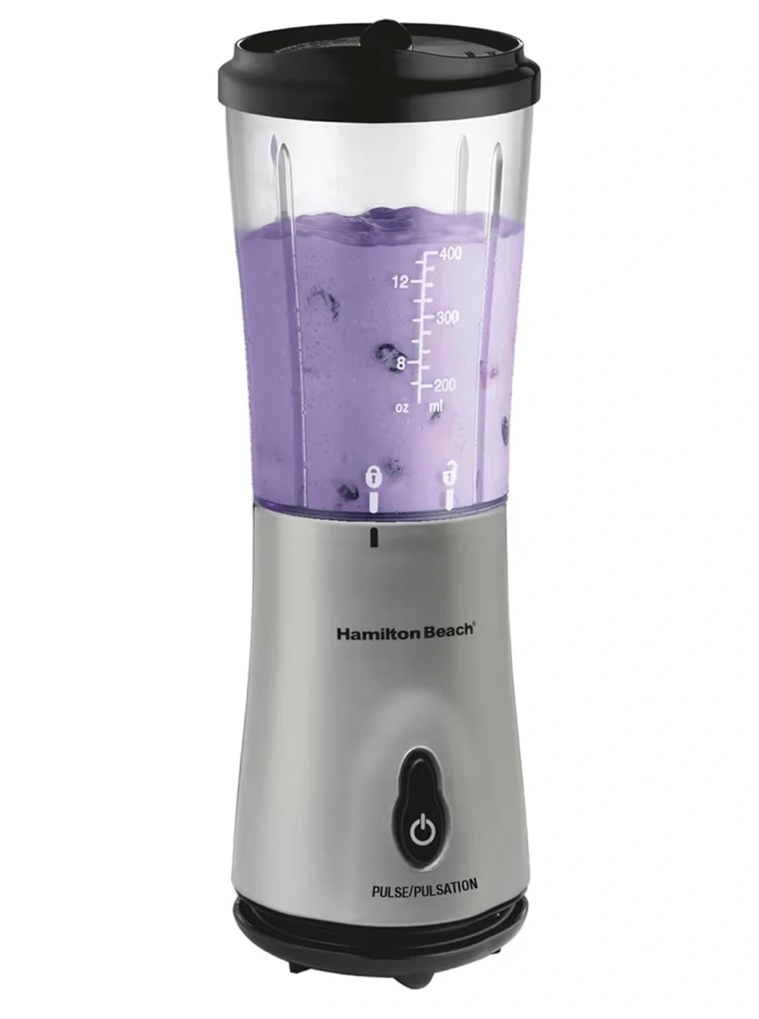 This Hamilton Beach personal blender is perfect for making smoothies and shakes on the go! It comes with a 14 oz, BPA-free jar and a sip-through travel lid. The compact size makes it easy to store and use.