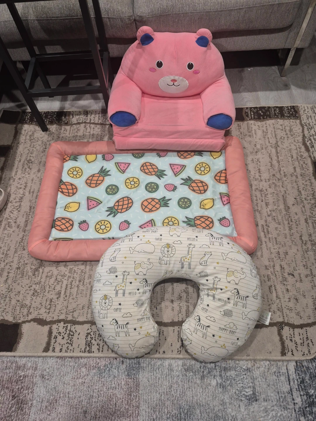 A cute pink bear floor seat for babies. It comes with a U-shaped feeding pillow featuring a fun animal pattern. Summer pet cooling mat for dogs or cats, Perfect for mealtime or relaxation. The floor seat is plush and comfortable.