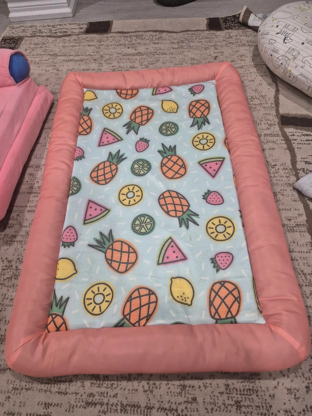 A cute pink bear floor seat for babies. It comes with a U-shaped feeding pillow featuring a fun animal pattern. Summer pet cooling mat for dogs or cats, Perfect for mealtime or relaxation. The floor seat is plush and comfortable.