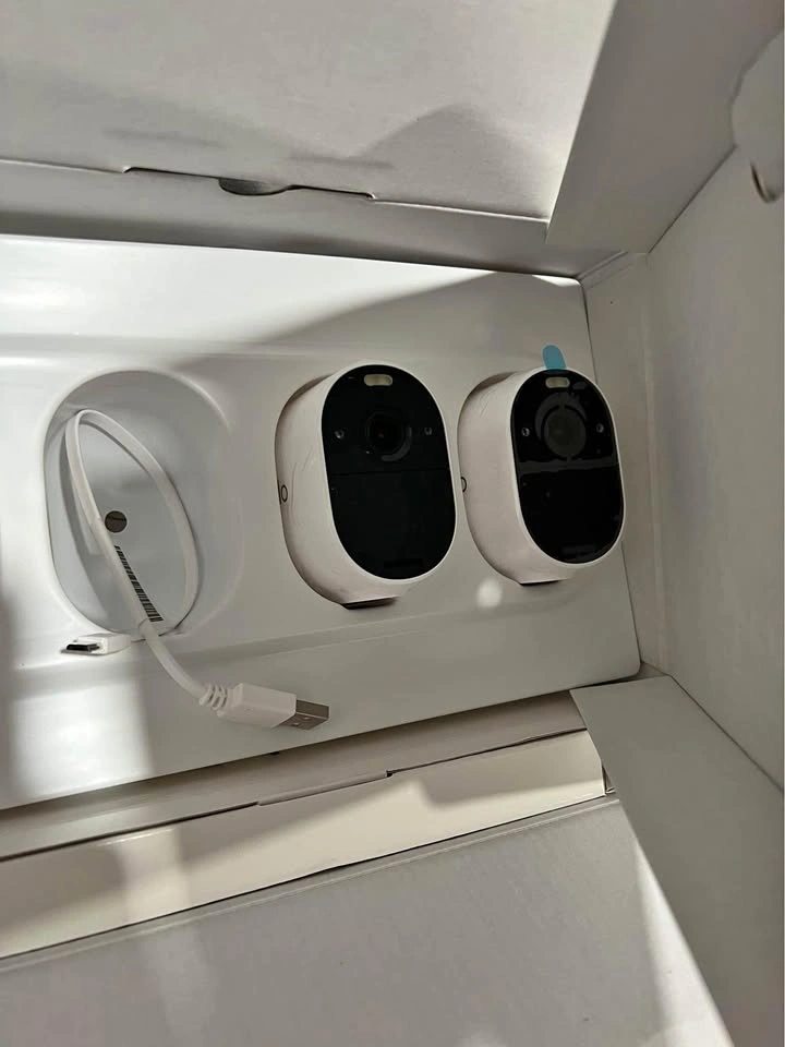 White wireless cameras with 1080 HD video. Features noise-cancelling 2-way audio, direct WiFi connection, colour night vision, and a built-in spotlight. Let me know if you're interested!