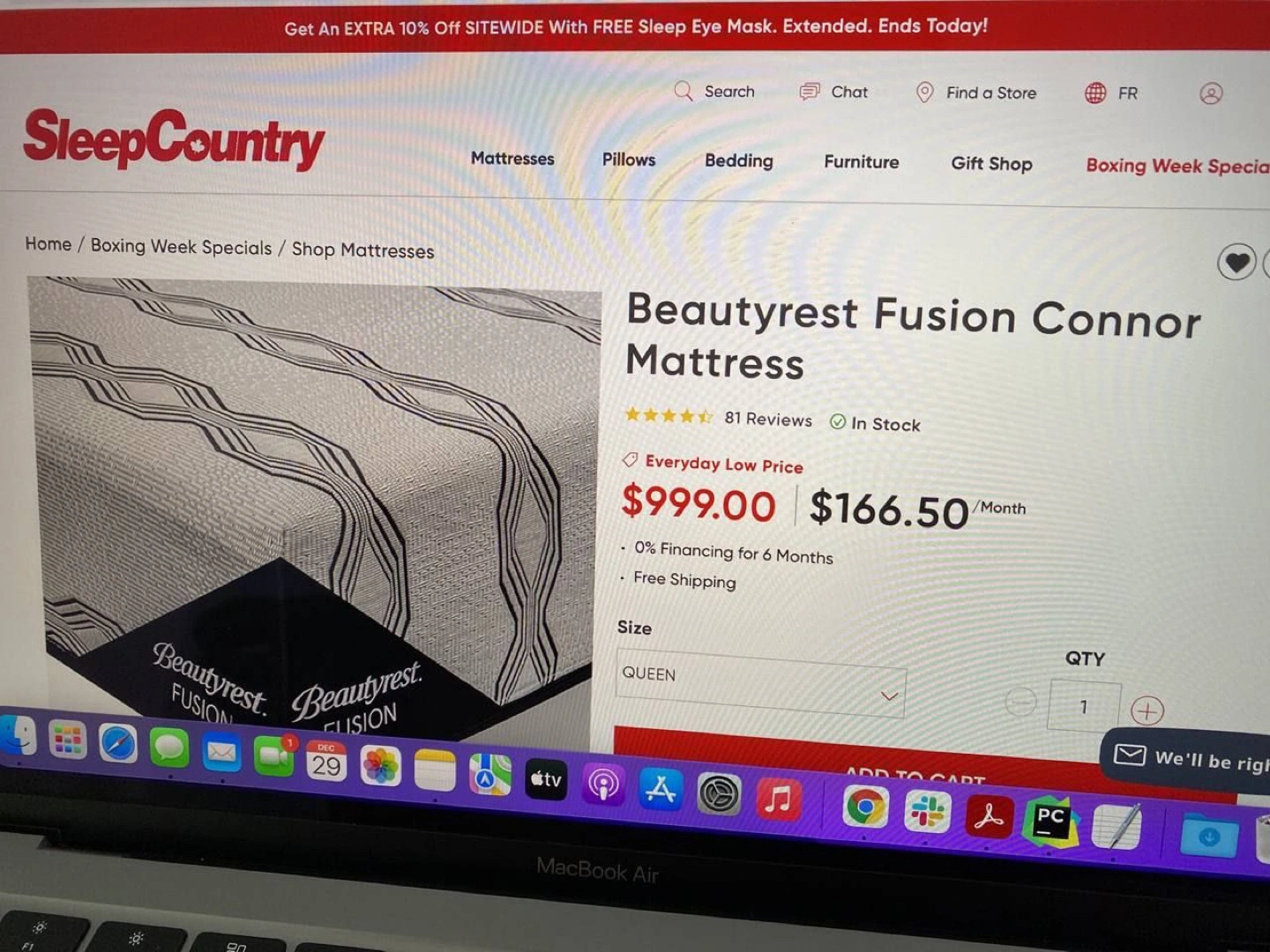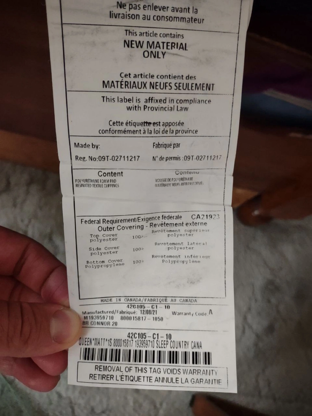 Selling a Beautyrest Fusion Connor mattress in queen size. The label indicates it contains new material only and is made in Canada. The outer covering is made of polyester and polypropylene.
