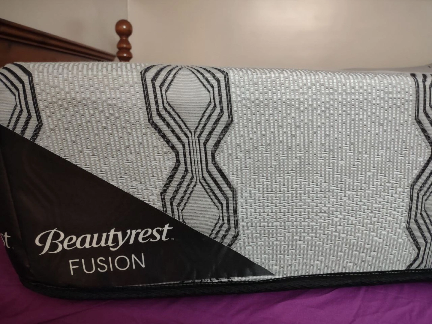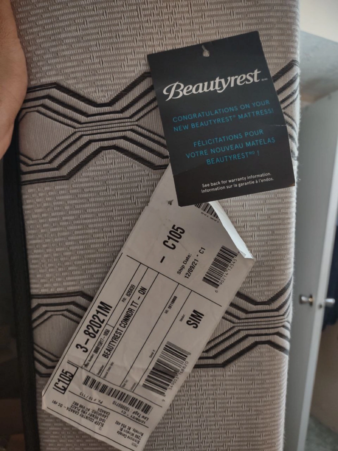 Selling a Beautyrest Fusion Connor mattress in queen size. The label indicates it contains new material only and is made in Canada. The outer covering is made of polyester and polypropylene.