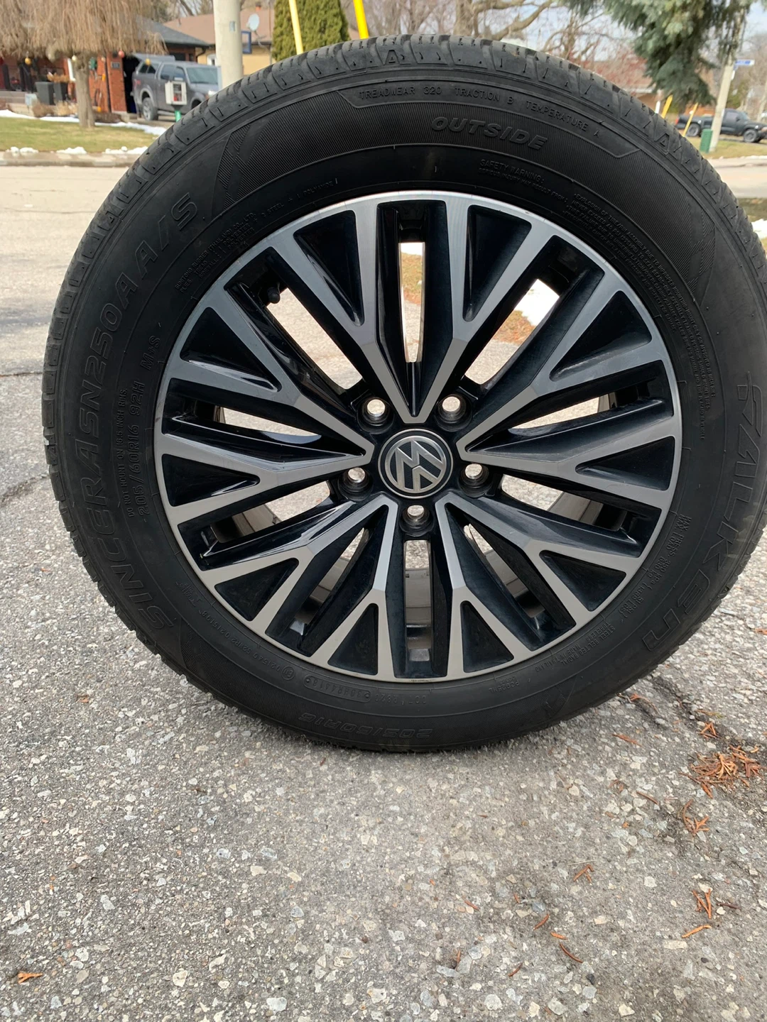 Set of four Volkswagen alloy wheels with tires. They're 17-inch wheels with a multi-spoke design. The tires are Goodyear Assurance 225/50R17.