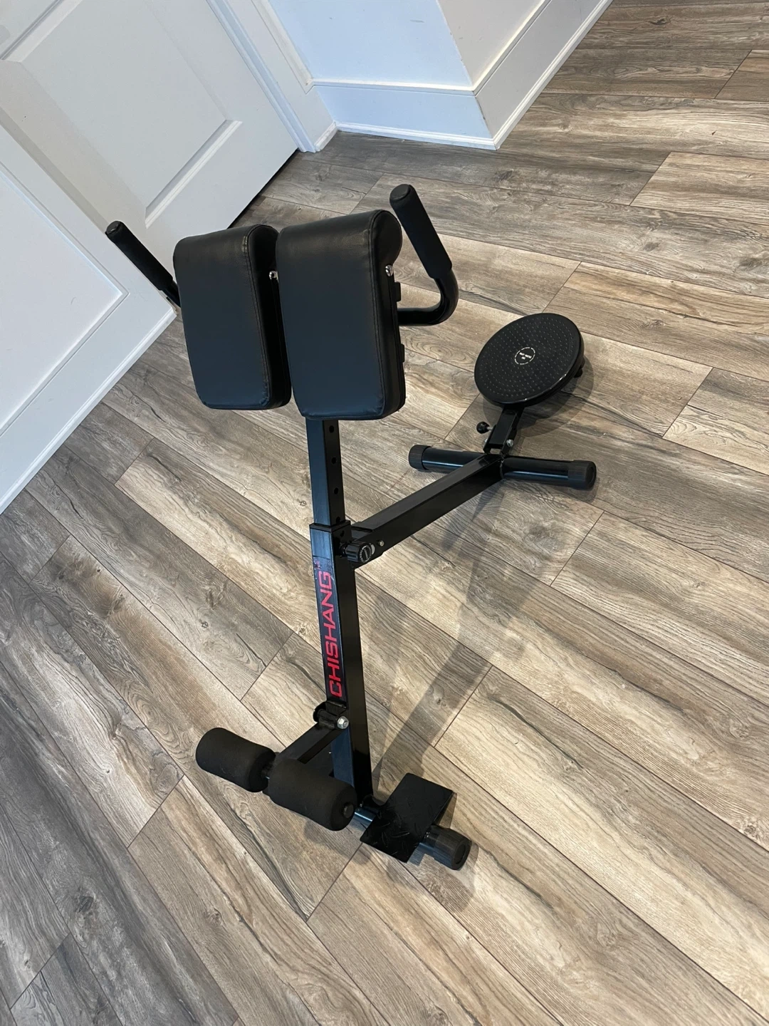 This CHISHANG hyperextension bench is designed for back and abdominal exercises. It features padded leg rests and handles for support. The device is made of durable metal and has a black finish.