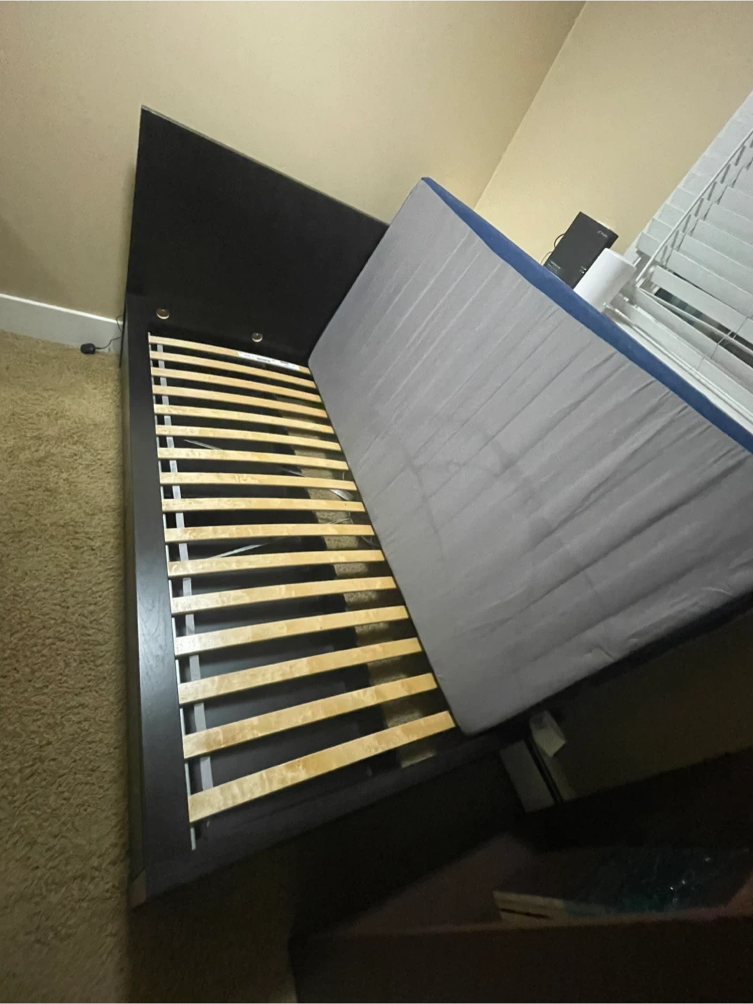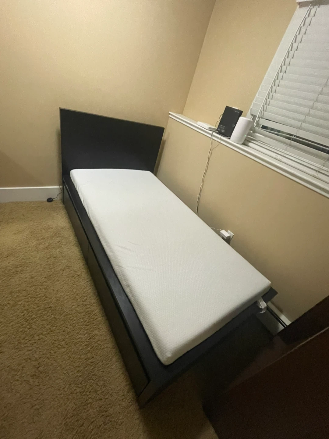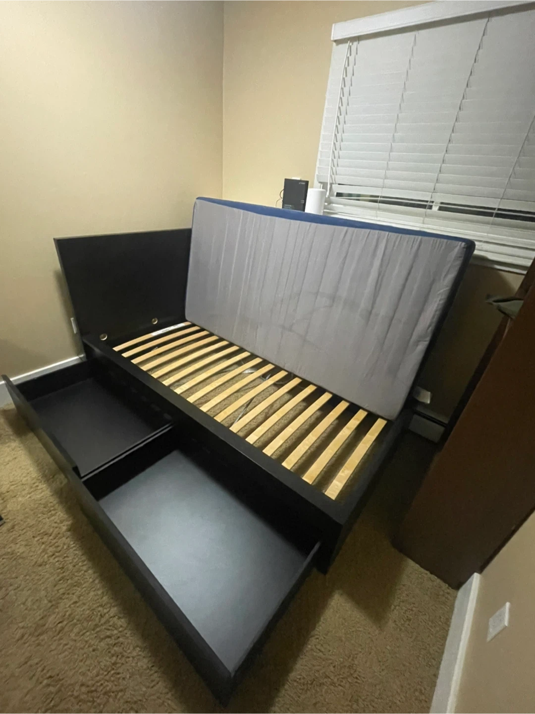 This black twin bed frame features two large storage drawers underneath. It's perfect for maximizing space in smaller rooms. The slatted bed base provides good mattress support.