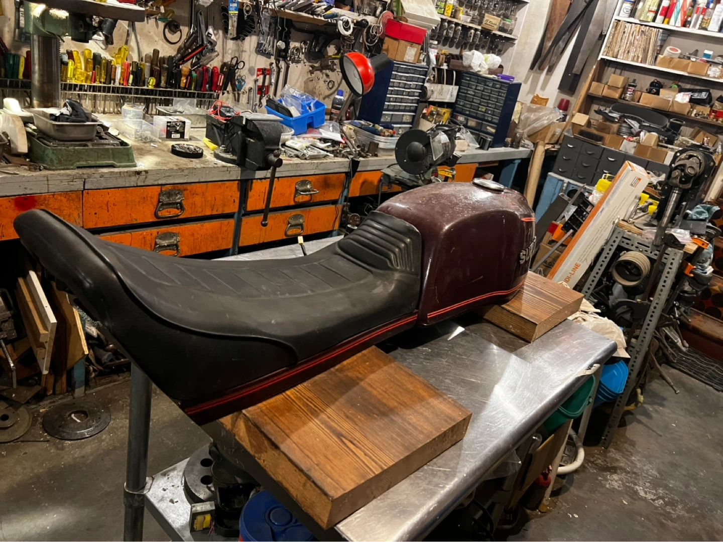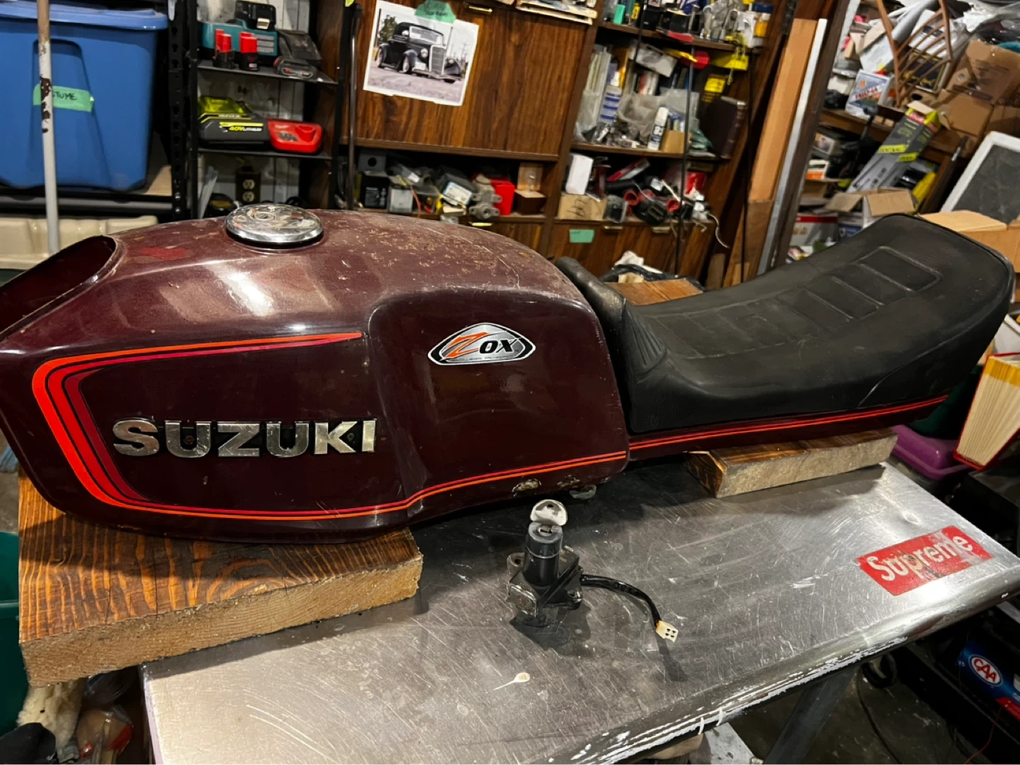 81 Suzuki GS 400 e tank and seat + ignition switch, key matches gas cap . Seat is near perfect . Tank is in need of of cosmetic repair but is straight and holds fuel. Could use a good flush