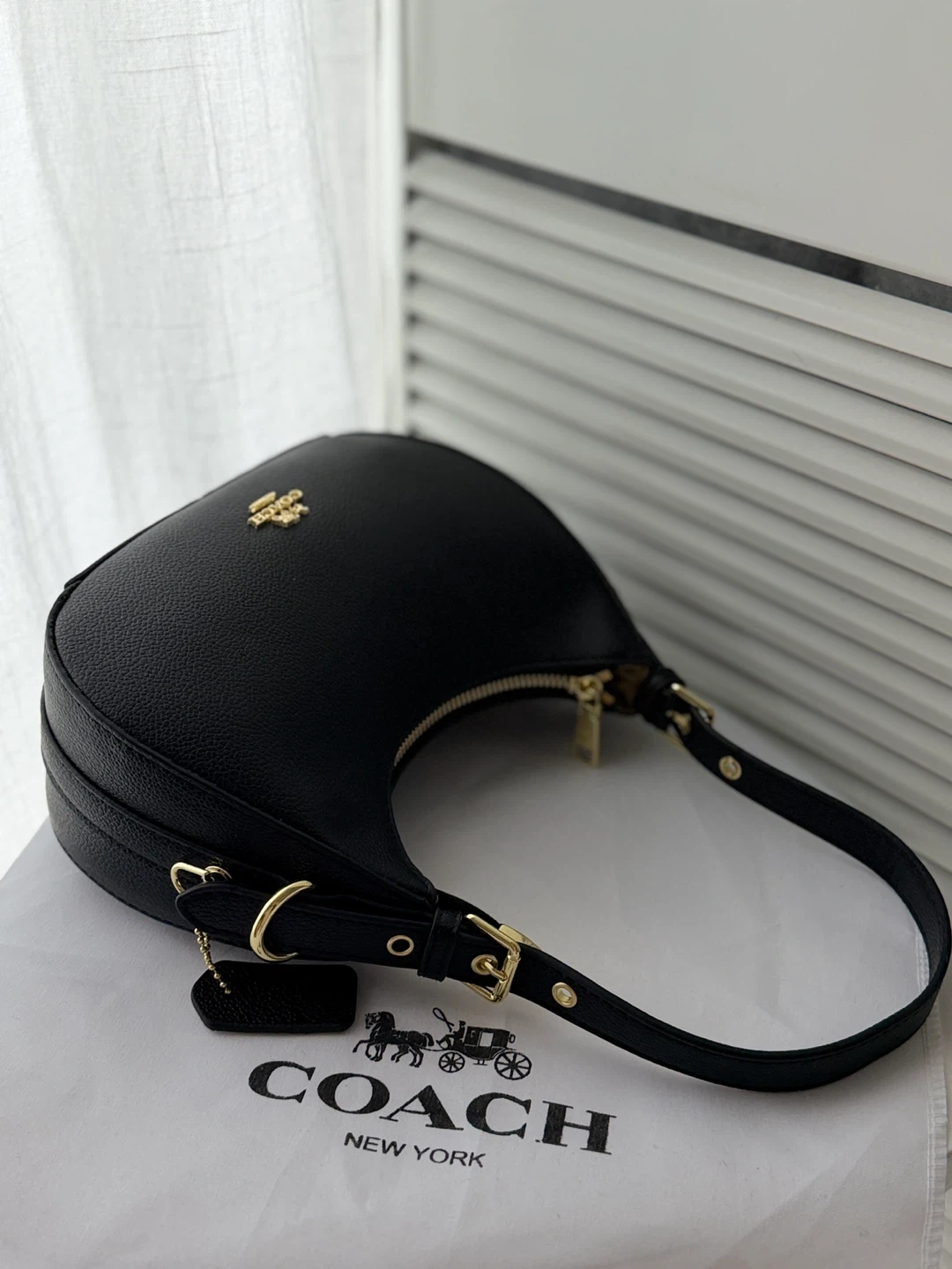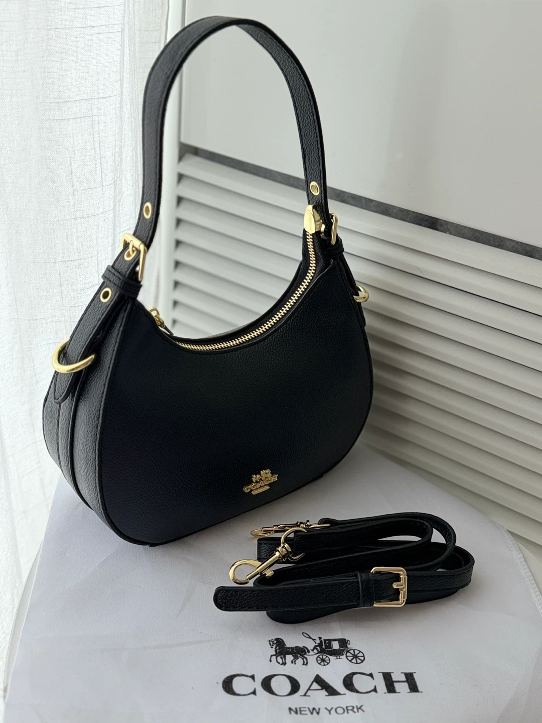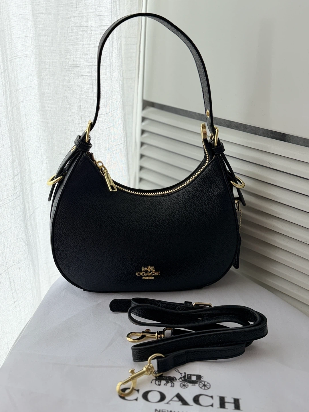 This is a black pebbled leather hobo shoulder bag by COACH. It features gold-tone hardware and a zip-top closure. It comes with an adjustable shoulder strap and a detachable crossbody strap.