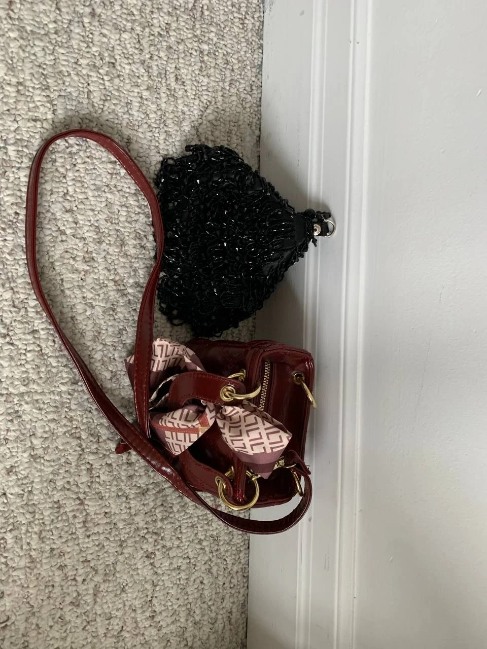 This is a shiny, dark red patent leather handbag. It comes with a decorative scarf tied to the handle and an adjustable shoulder strap. It also includes a black beaded clutch. Take 2 for $5