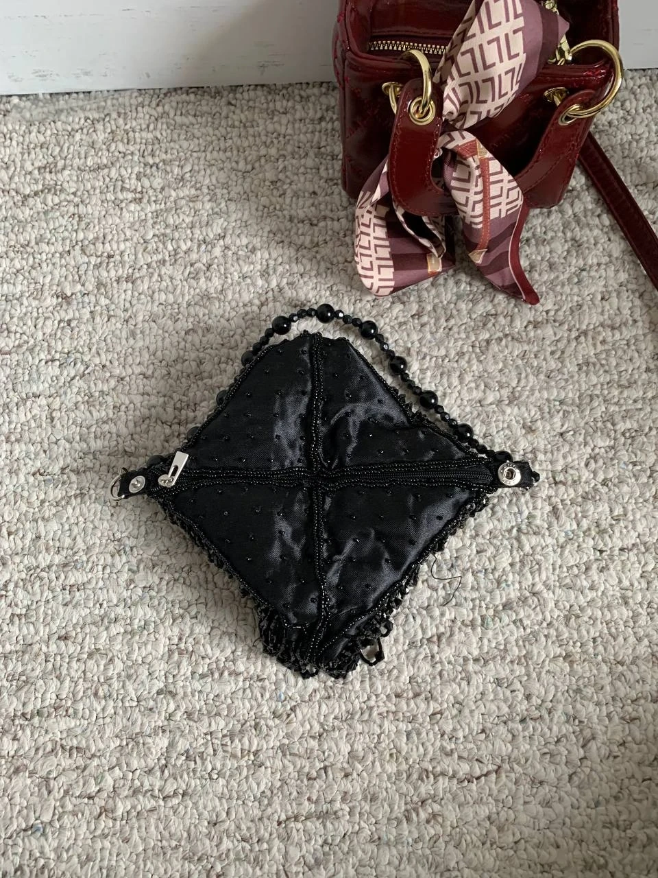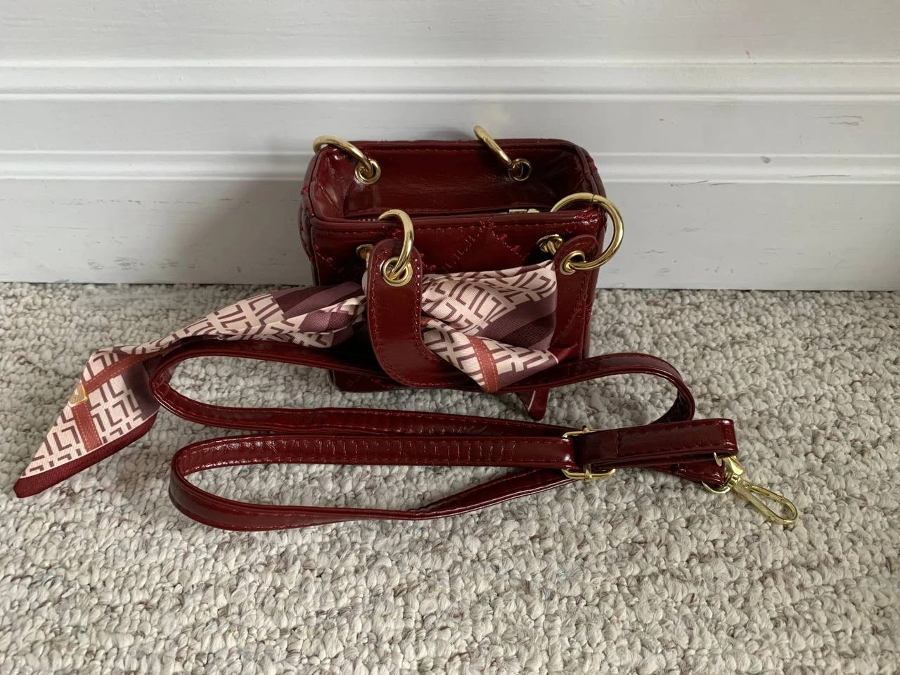 This is a shiny, dark red patent leather handbag. It comes with a decorative scarf tied to the handle and an adjustable shoulder strap. It also includes a black beaded clutch. Take 2 for $5