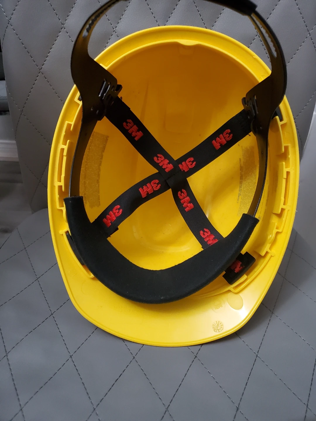This is a yellow 3M hard hat. It features an adjustable suspension system for a comfortable fit. It's designed for head protection on job sites.