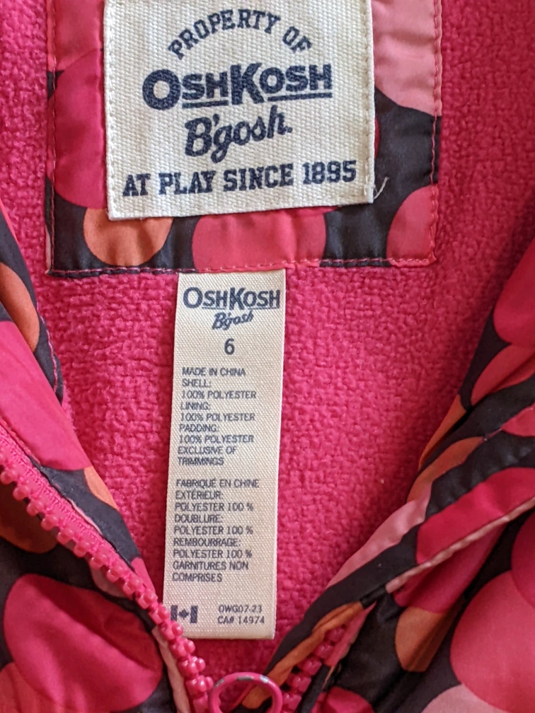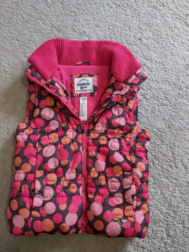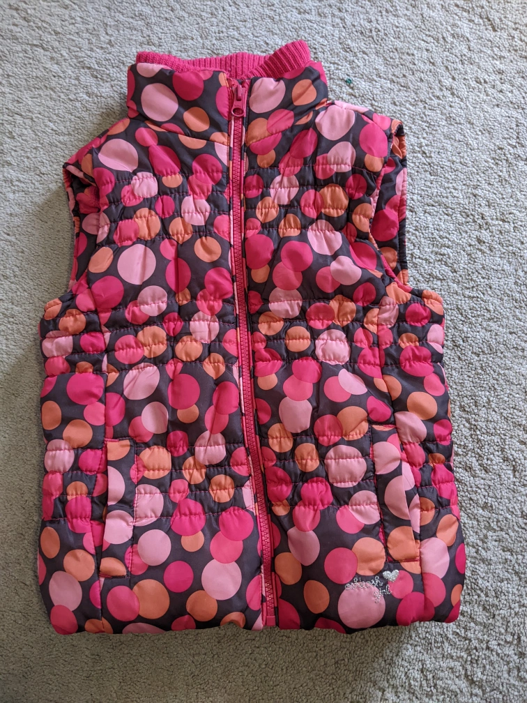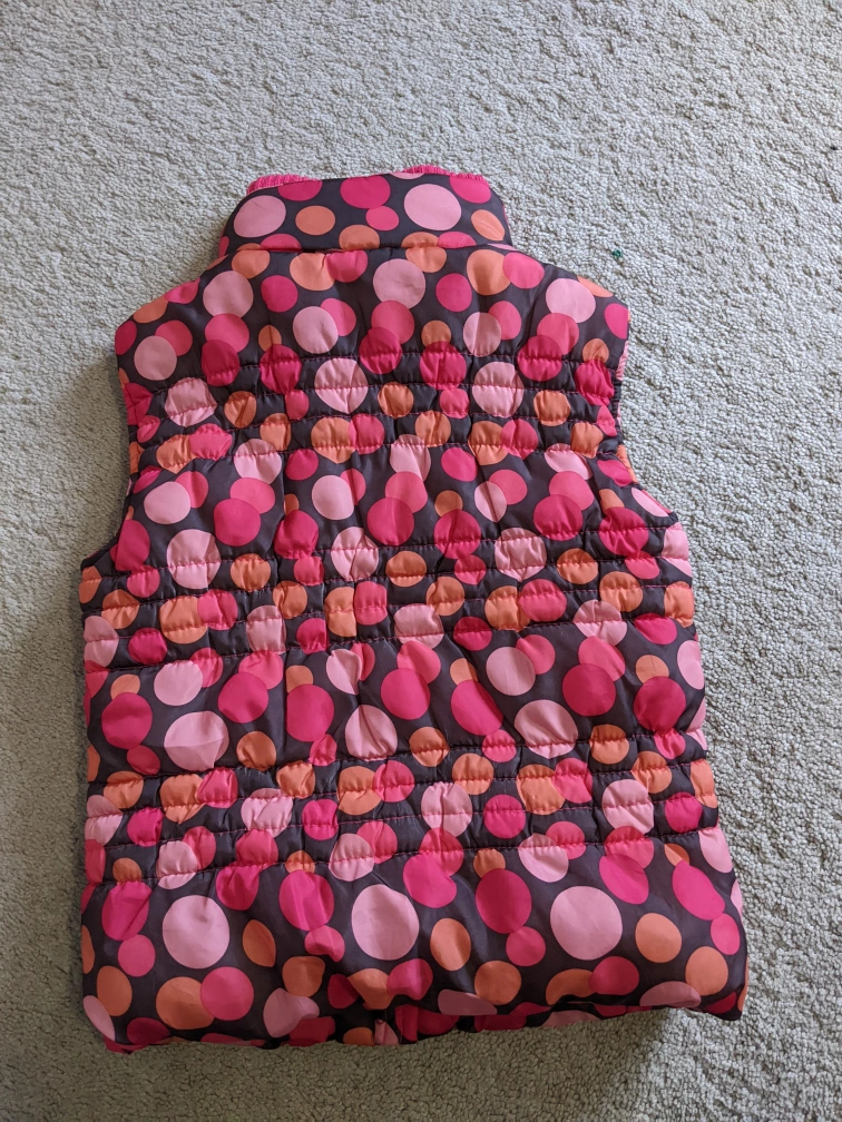 Size 6 girl's vest with pink polka dots and a pink lining. Super soft. Worn a few times. Zipper that's easy to open. Perfect for winter, fall, and spring. Payment is cash only and pickup only.