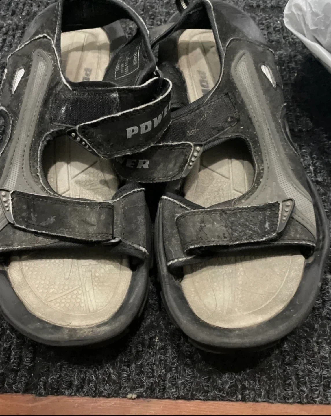 These are men's Power brand sandals. They feature adjustable velcro straps for a secure fit. The textured footbed provides some grip. Good for casual wear and outdoor activities.