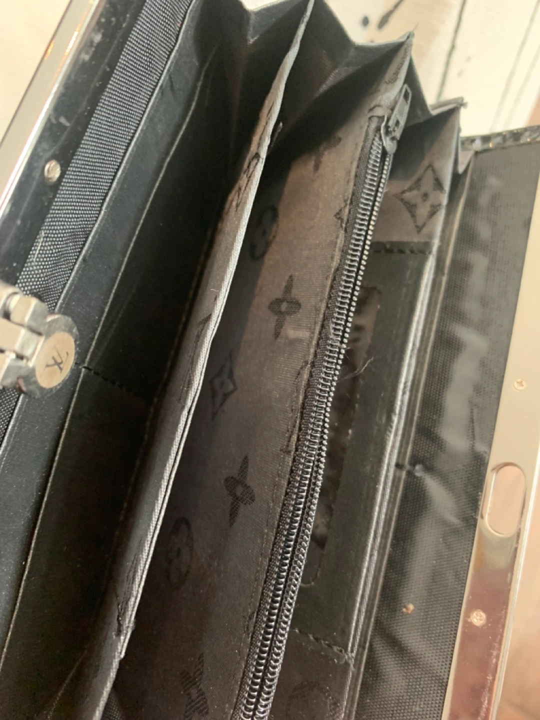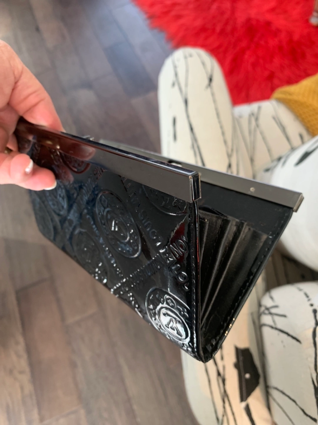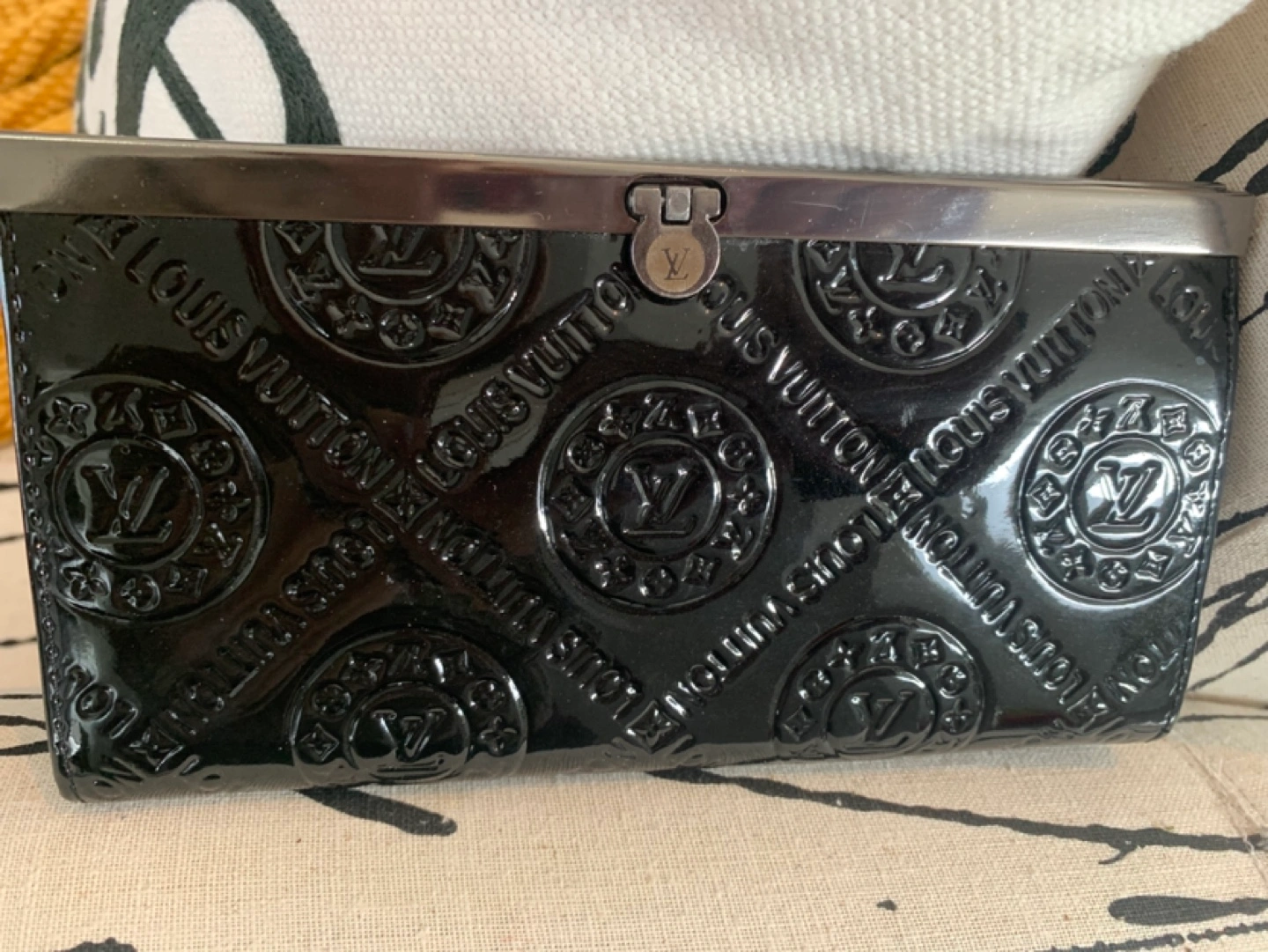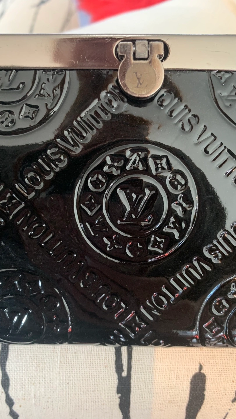 Black patent leather wallet. Features a metallic clasp closure and multiple card slots. Interior is black fabric with Louis Vuitton branding. Pre-owned. Not real