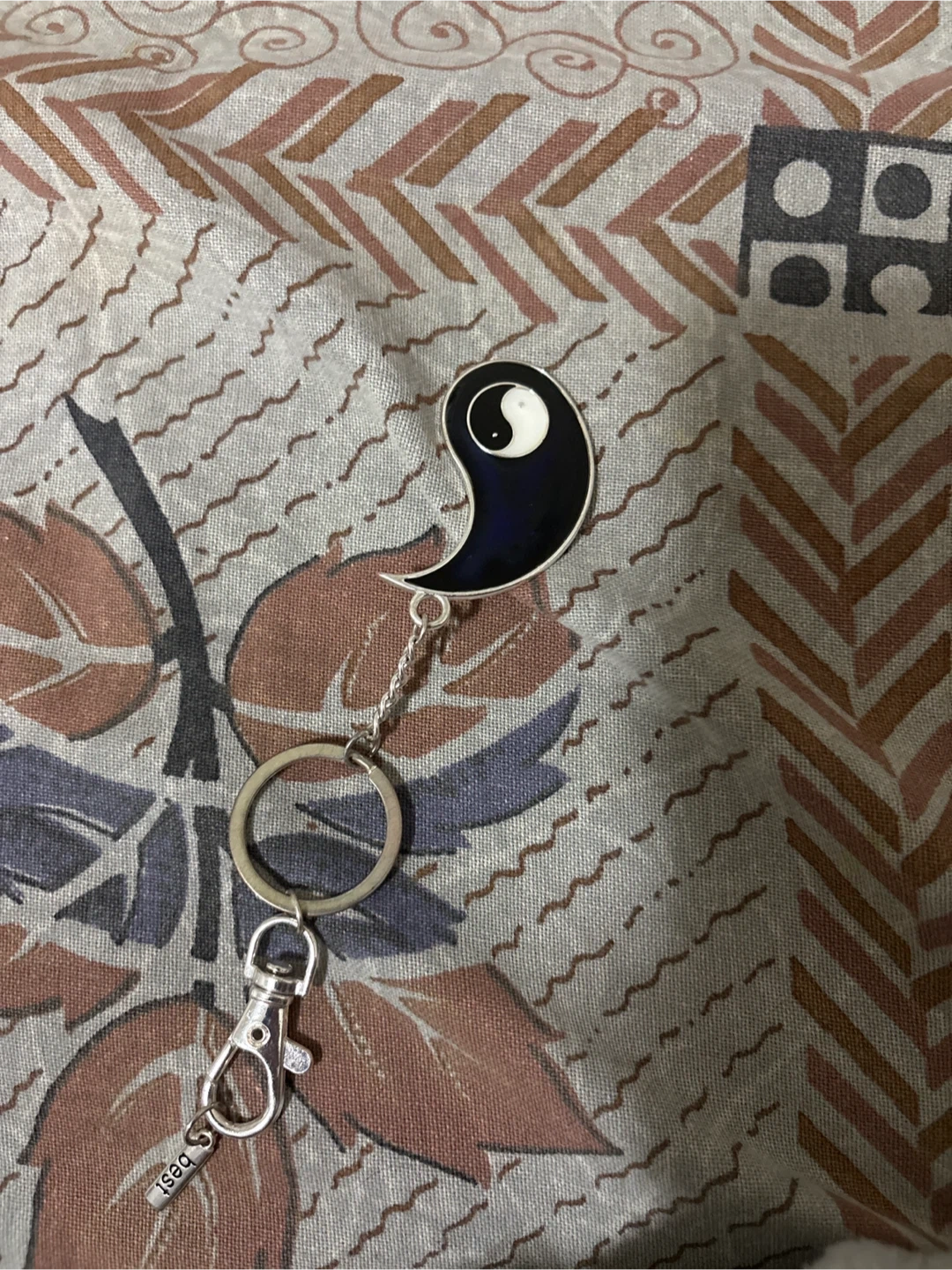 This keychain features a Yin Yang charm with a dark blue and white design. It's attached to a silver-tone keyring and clasp. The charm is made of enamel and metal.