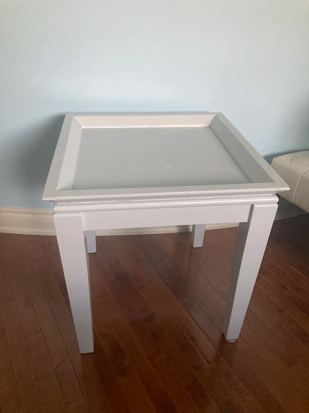 This light grey side table features a convenient tray top design. Its simple construction makes it a practical addition to any room. The table's neutral colour blends well with existing decor. Solid wood construction.