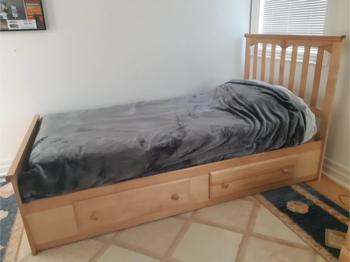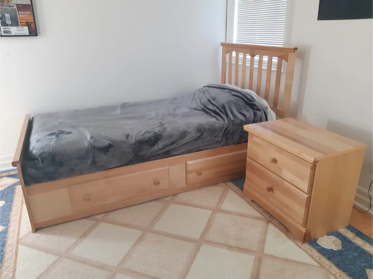 Twin bed and matching nightstand in a gorgeous oak colour. Made of solid wood, very sturdy. Bed and nightstand each have two drawers. In great condition.