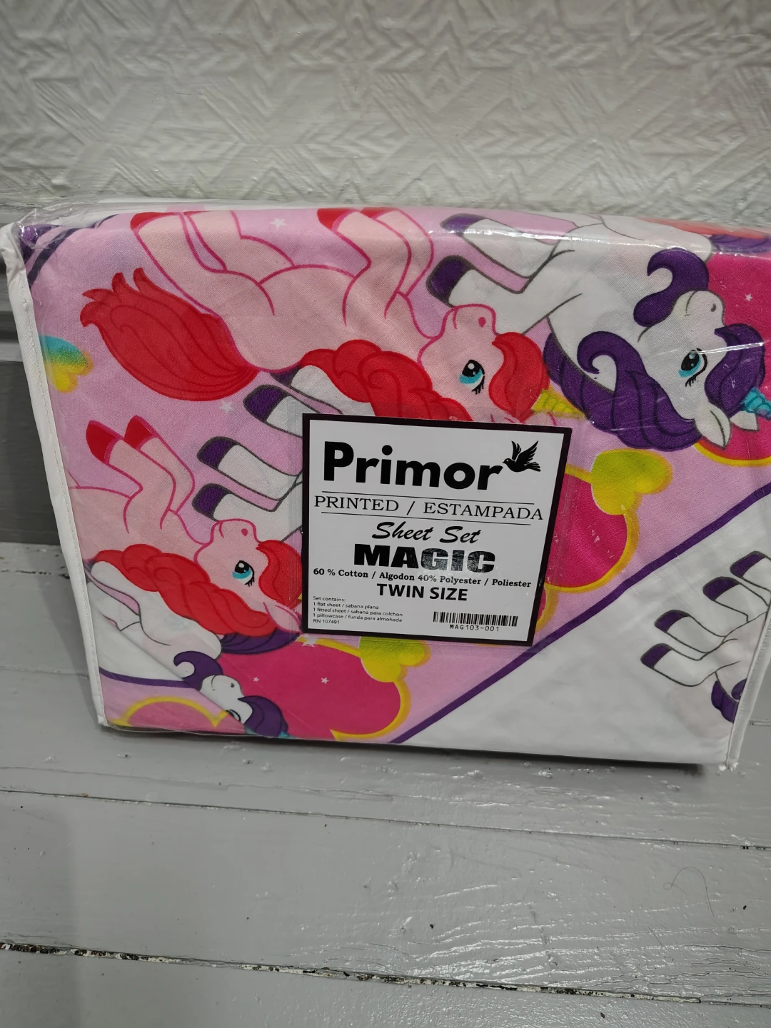 I'm selling a brand new Primor Magic sheet set! It's a twin size and includes one flat sheet, one fitted sheet, and one pillowcase. The material is 60% cotton and 40% polyester.