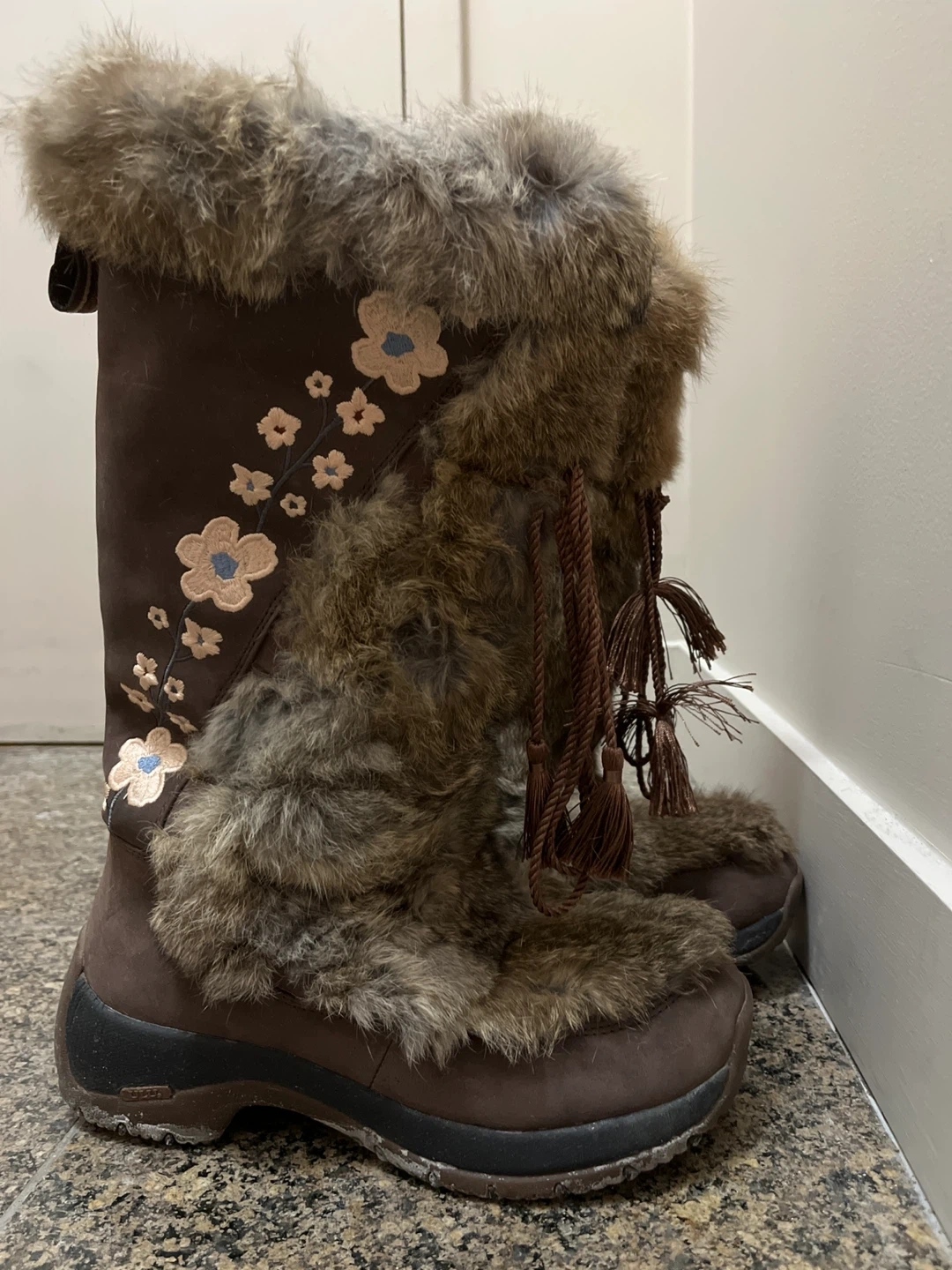 Brown Fur Winter Boots with Floral Embroidery