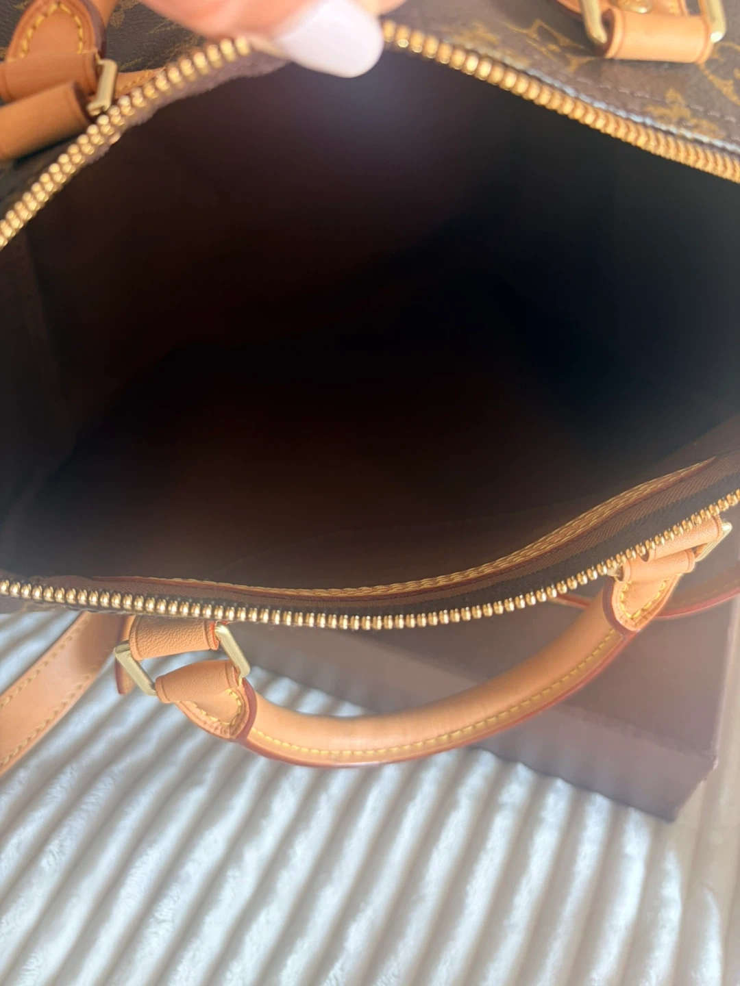 This is a Louis Vuitton Speedy Bandoulière 30 bag in the Monogram. It comes with a leather strap for shoulder or crossbody wear. The interior is lined and features a zip closure.