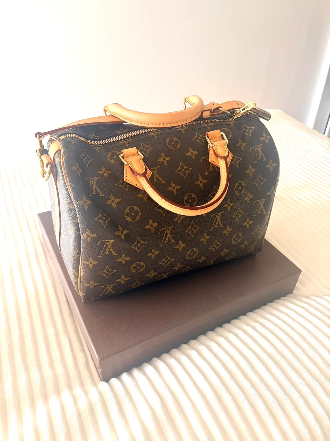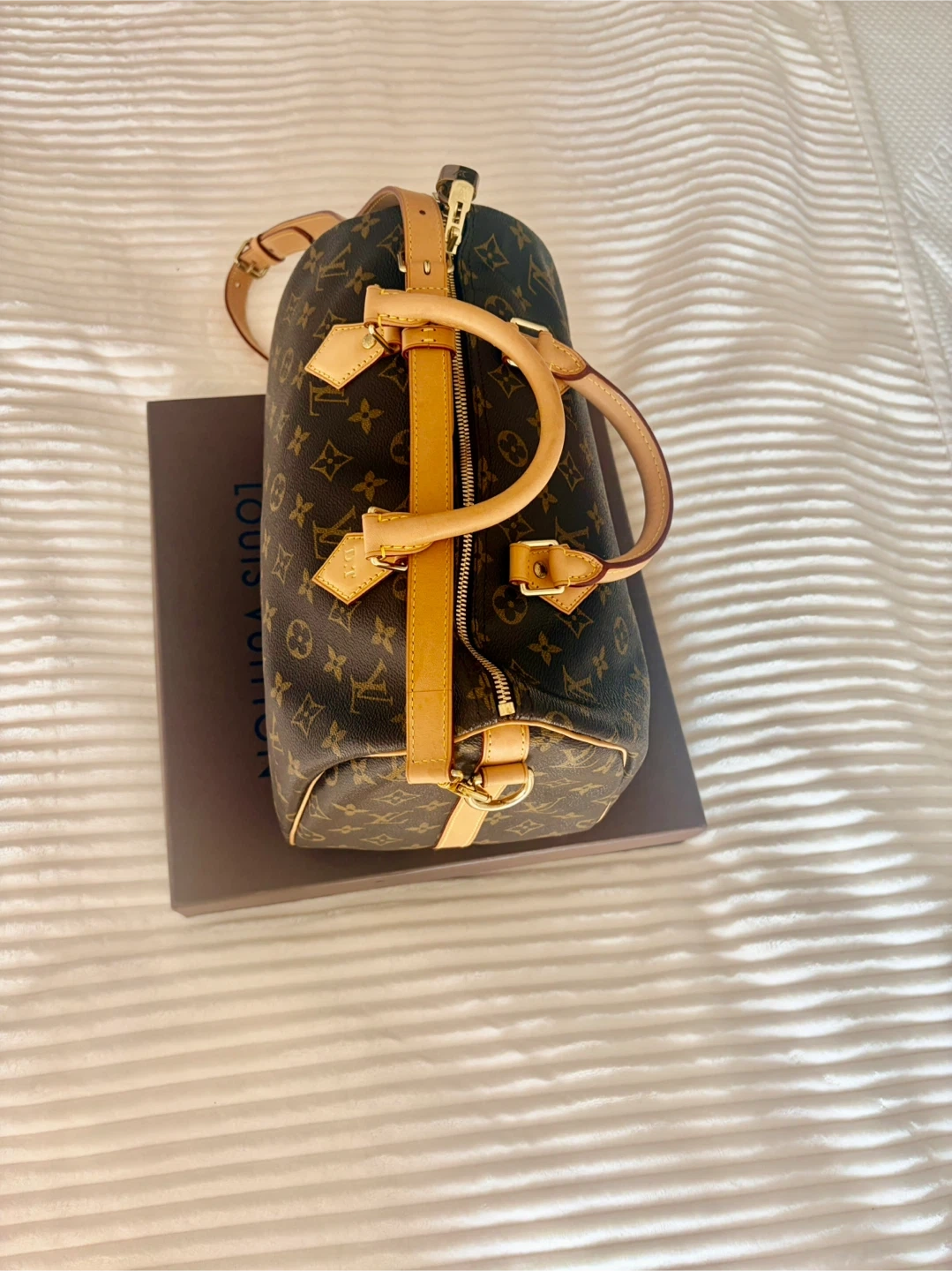 This is a Louis Vuitton Speedy Bandoulière 30 bag in the Monogram. It comes with a leather strap for shoulder or crossbody wear. The interior is lined and features a zip closure.