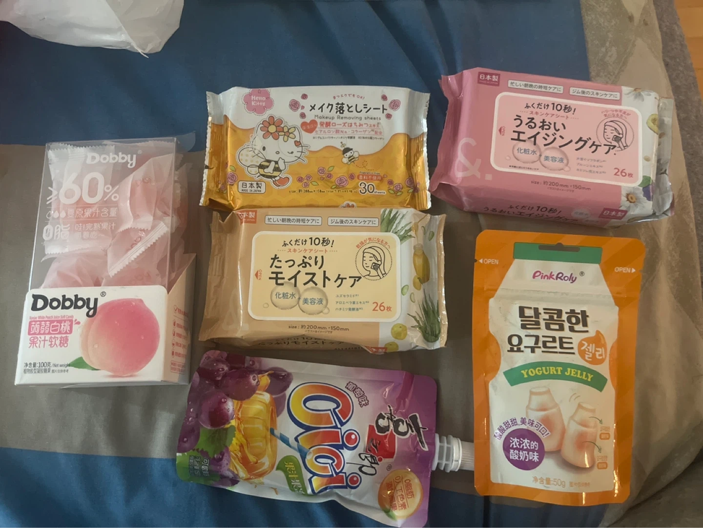 Dobby brand white peach soft candies. Each piece contains 60% fruit juice. Comes in a convenient resealable package. Bundle also comes with 3 unopened packed of makeup wipes. Yogurt jelly candies. And a jello drink. TAKE ALL FOR 20$