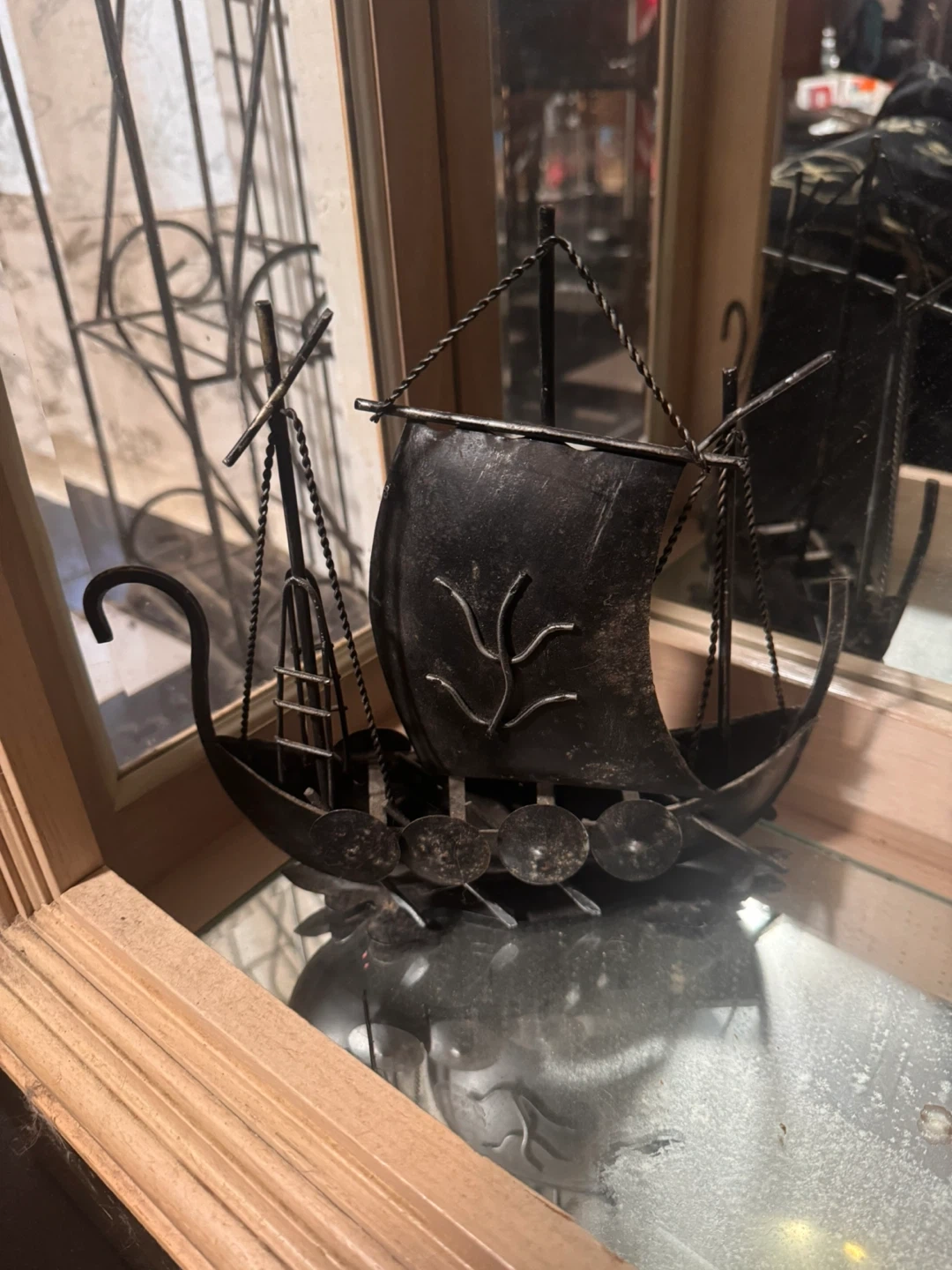 This is a black metal model of a Viking ship. It's a decorative piece with a detailed sail and oars. It would make a unique addition to any collection!