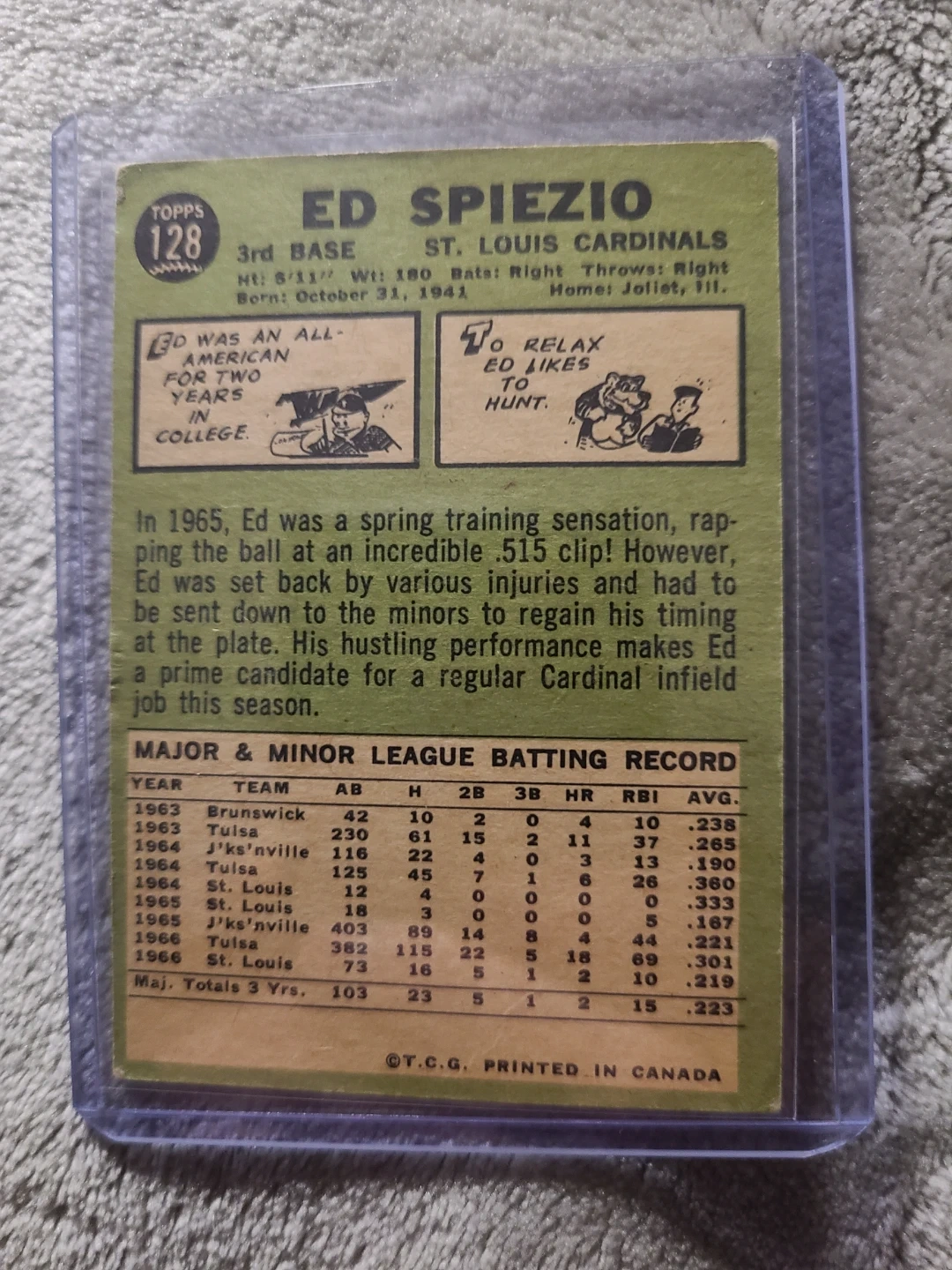 1967 Topps baseball card featuring Ed Spiezio, St. Louis Cardinals, number 128. Includes player stats and biographical information on the reverse.