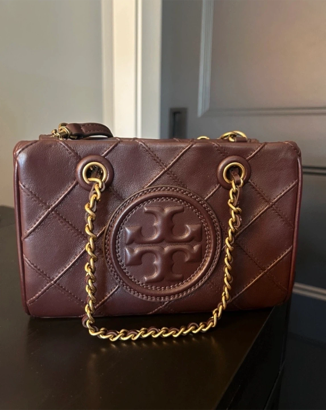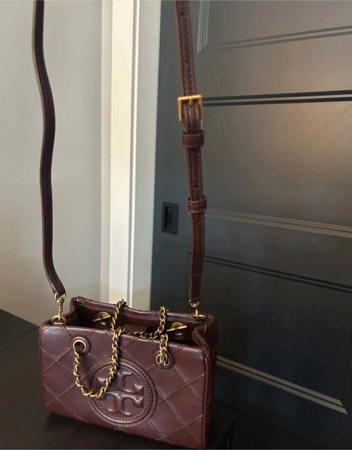 Burgundy Tory Burch mini Fleming bag with short gold chain strap and long detachable leather shoulder strap.