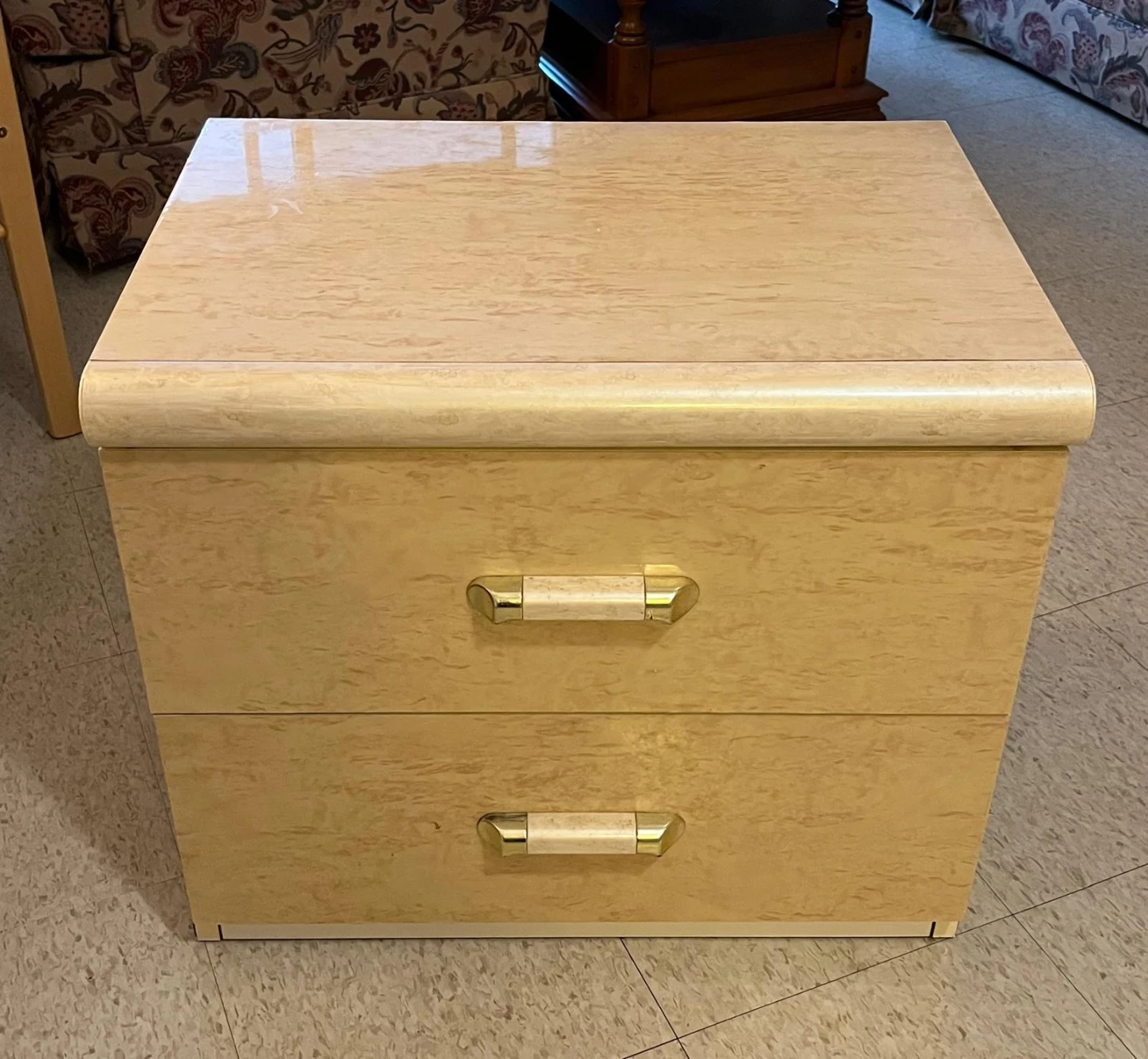 Selling a side table featuring two drawers. It has a unique wood-like finish and stylish handles. Perfect for adding some storage and style to your bedroom or living room!