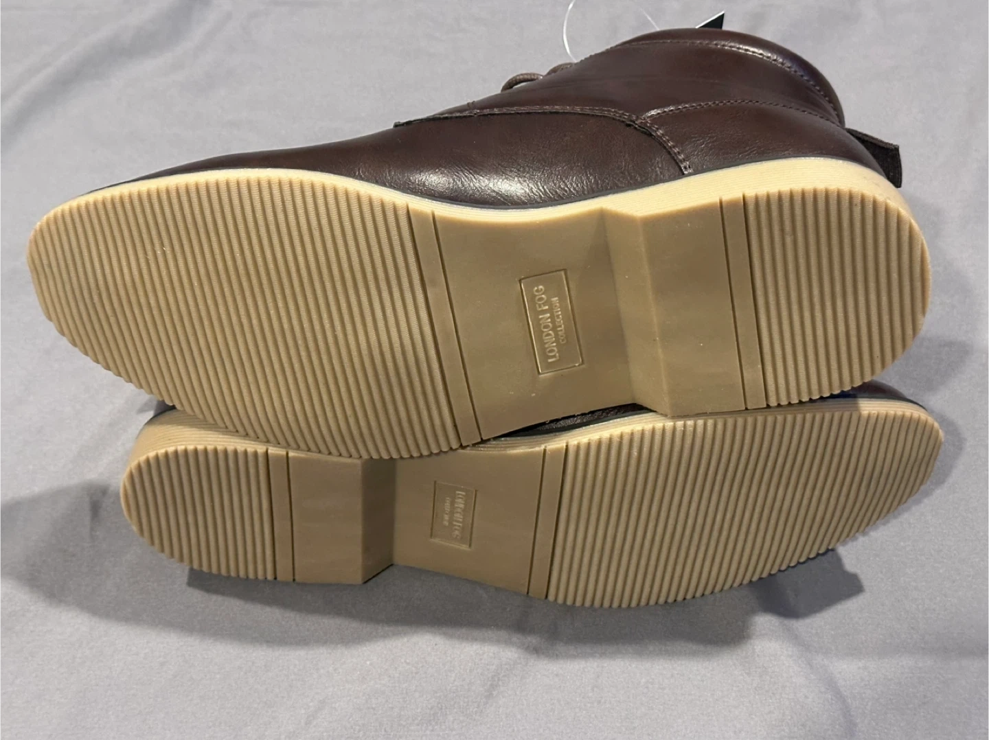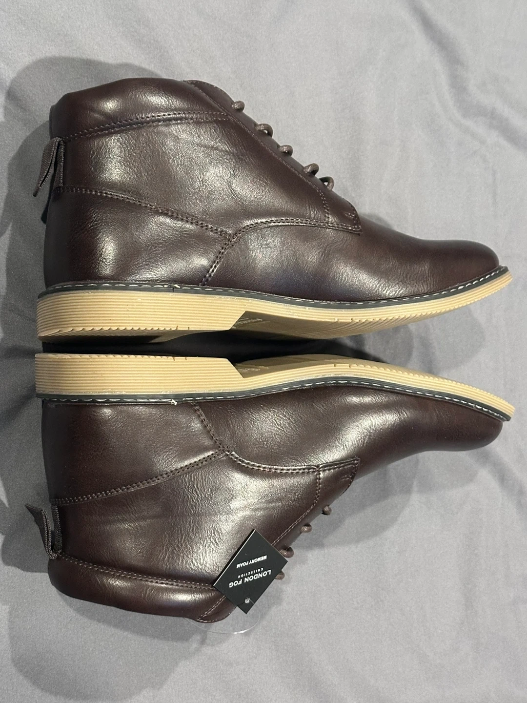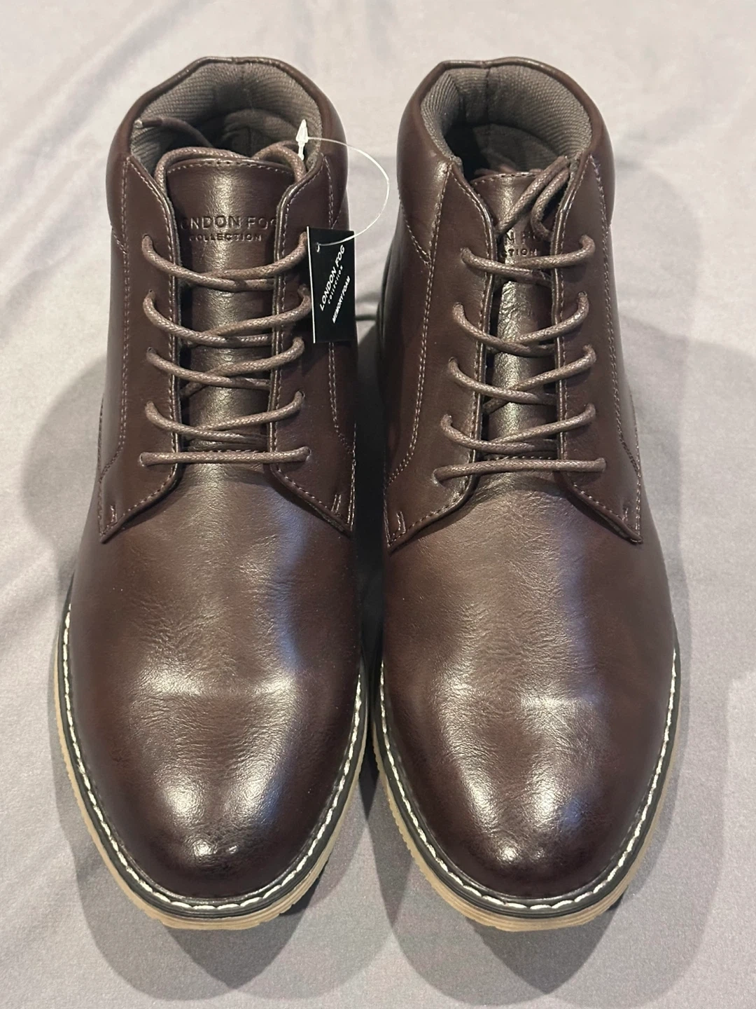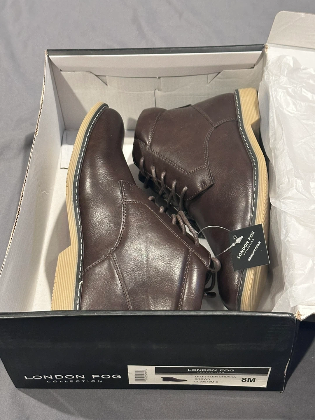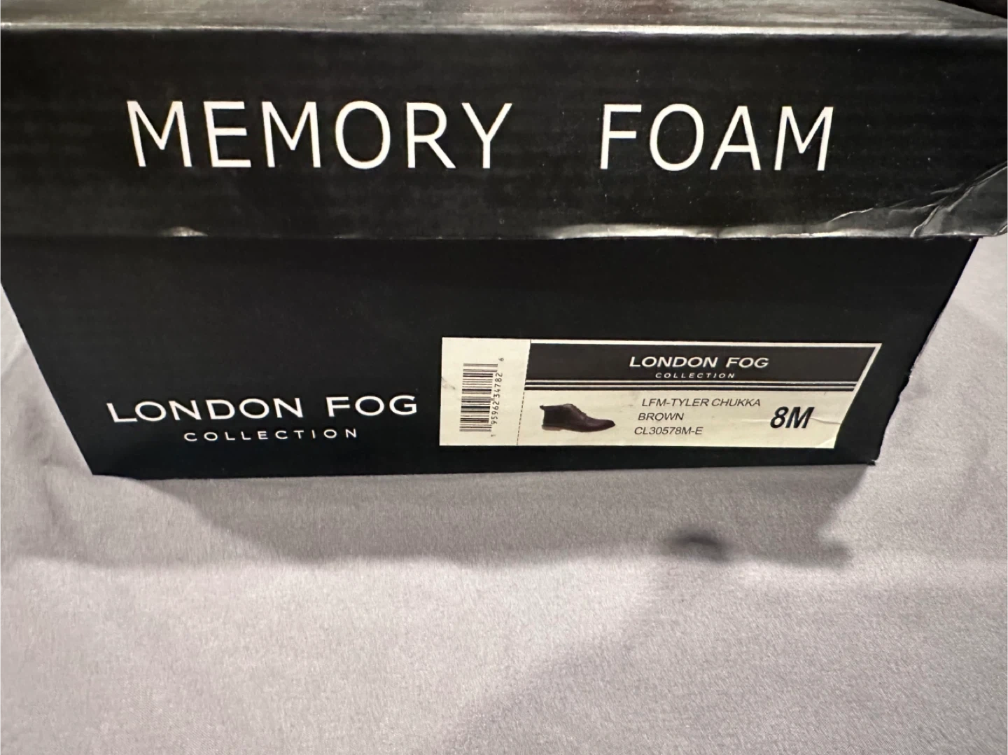 These London Fog men's chukka boots are a rich brown color and size 8M. They feature memory foam insoles for comfort. Includes original box and packaging.