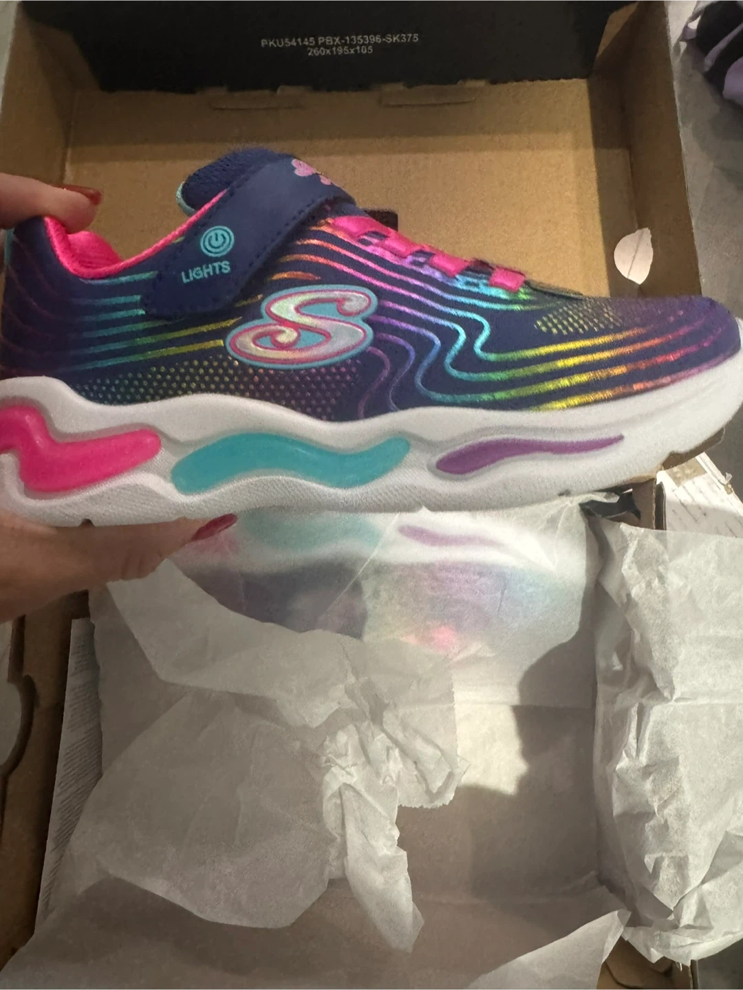 These colorful Skechers "S Lights" shoes feature a wavy, multi-color design. They're designed for kids and light up when worn. Includes original box and packaging. Size 1.5 US kids.